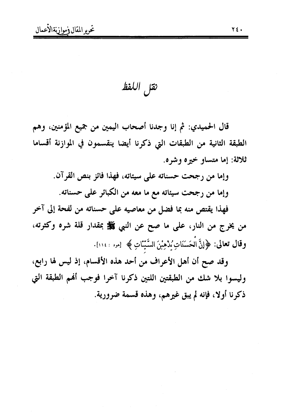 قال الحميدي: ثم إنا وجدنا أصحاب اليمين من جميع المؤمنين، وهم الطبقة الثانية من الطبقات التي ذكرنا أيضا ينقسمون في الموازنة أقساما ثلاثة: إما متساو خيره وشره.