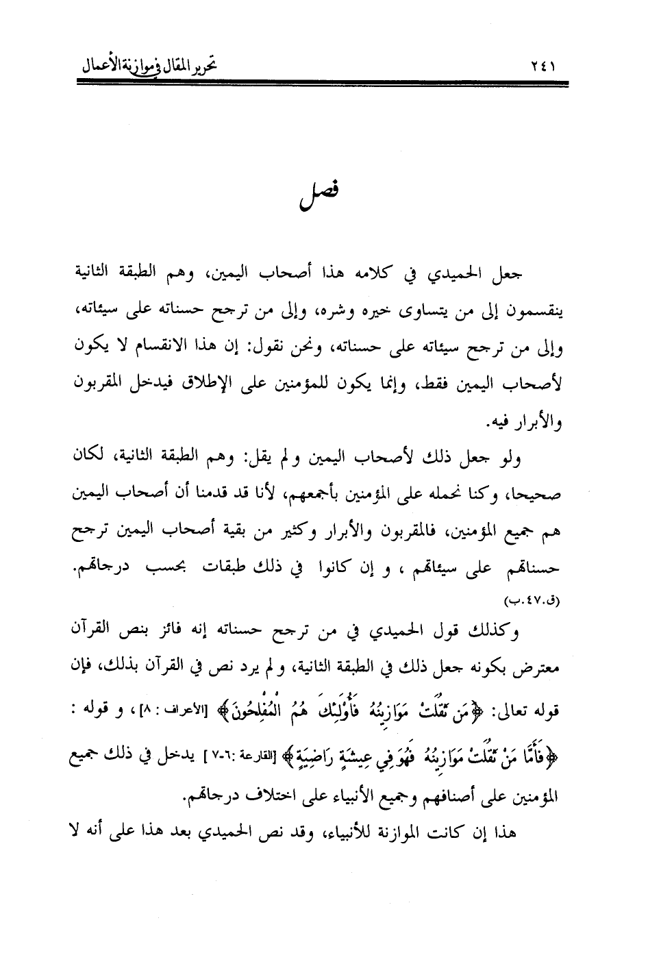 وكذلك قول الحميدي في من ترجح حسناته إنه فائز بنص القرآن معترض بكونه جعل ذلك في الطبقة الثانية، ولم يرد نص في القرآن بذلك، فإن قوله تعالى: {مَن ثَقُلَتْ مَوَازِينُهُ فَأُوْلَئِكَ هُمُ الْمُفْلِحُونَ} [الأعراف: 8]، وقوله: {فَأَمَّا مَنْ ثَقُلَتْ مَوَازِينُهُ فَهُوَ فِي عِيشَةٍ رَاضِيَةٍ} [القارعة:6 - 7] يدخل في ذلك جميع المؤمنين على أصنافهم وجميع الأنبياء على اختلاف درجاتهم.