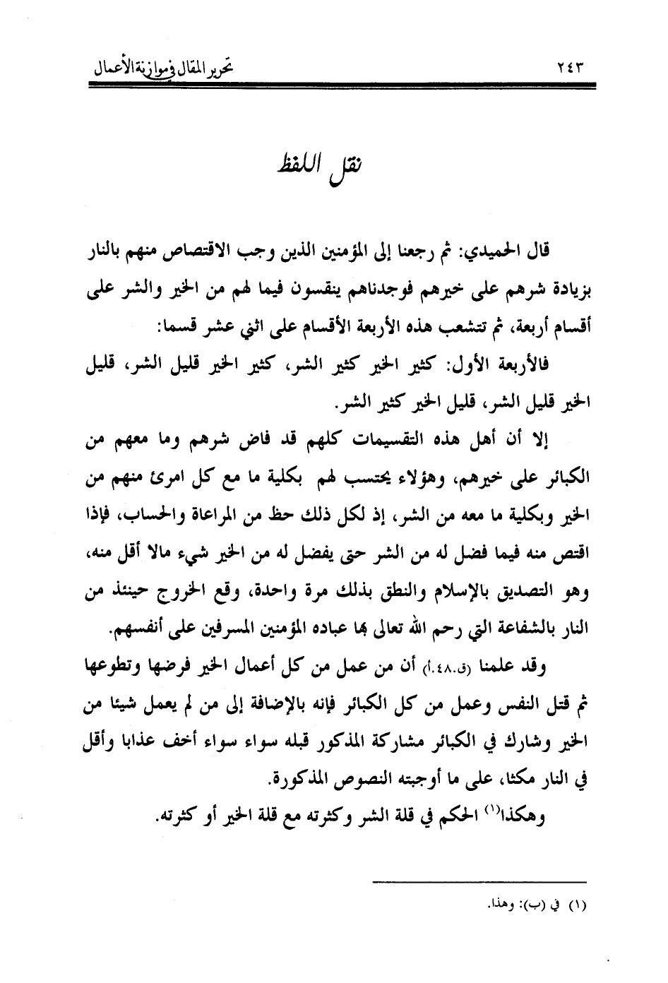 قال الحميدي: ثم رجعنا إلى المؤمنين الذين وجب الاقتصاص منهم بالنار بزيادة شرهم على خيرهم فوجدناهم ينقسون فيما لهم من الخير والشر على أقسام أربعة، ثم تتشعب هذه الأربعة الأقسام على اثني عشر قسما: