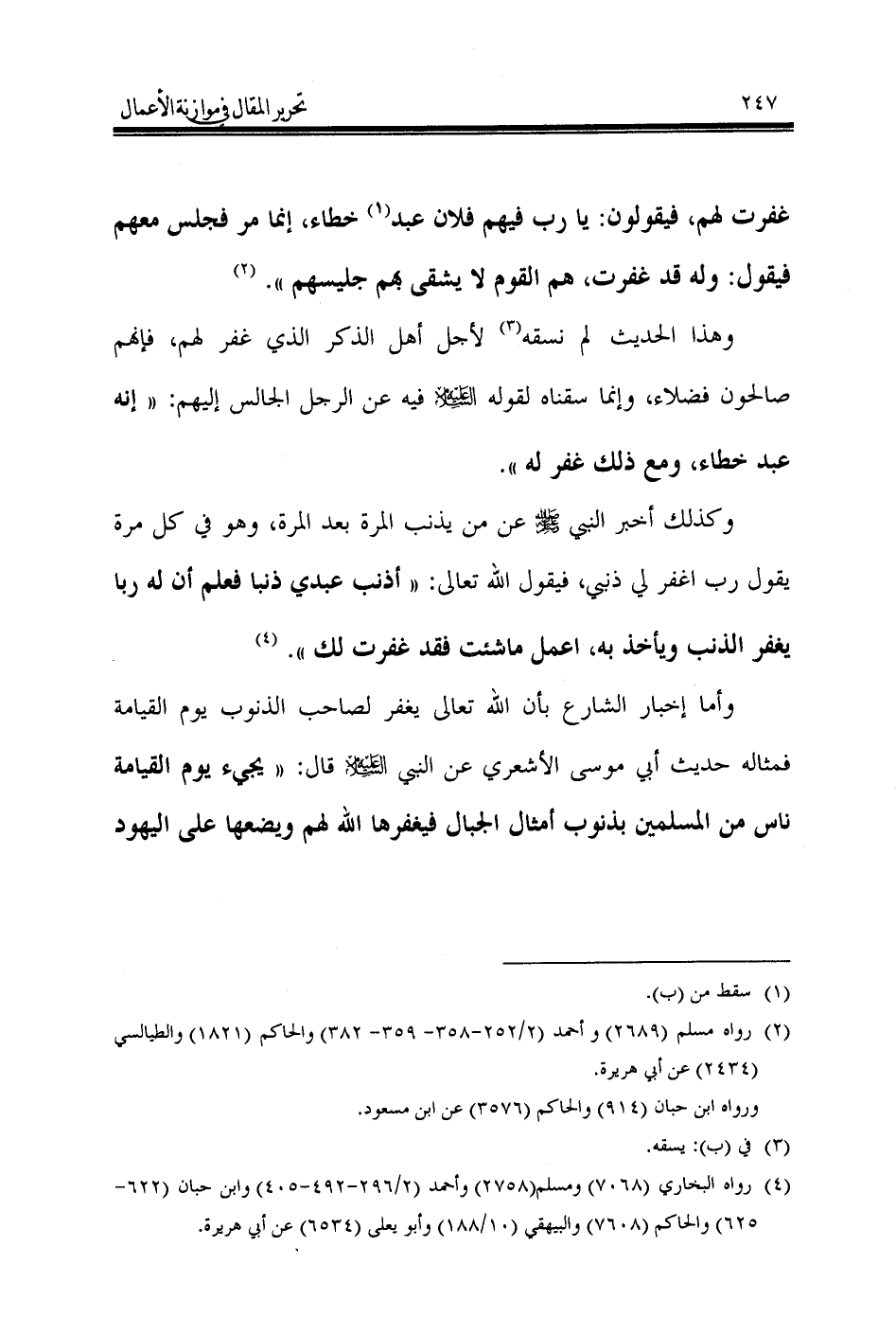 وكذلك أخبر النبي - صَلَّى اللهُ عَلَيْهِ وَسَلَّمَ - عن من يذنب المرة بعد المرة، وهو في كل مرة يقول رب اغفر لي ذنبي، فيقول الله تعالى: «أذنب عبدي ذنبا فعلم أن له ربا يغفر الذنب ويأخذ به، اعمل ماشئت فقد غفرت لك». (¬4)
