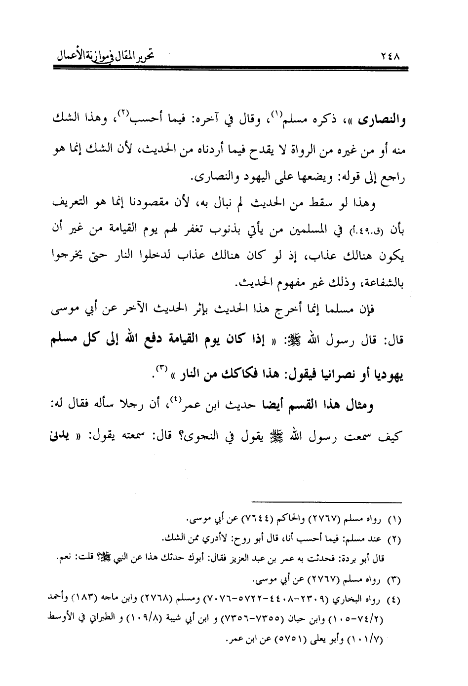 فإن مسلما إنما أخرج هذا الحديث بإثر الحديث الآخر عن أبي موسى قال: قال رسول الله - صَلَّى اللهُ عَلَيْهِ وَسَلَّمَ -: «إذا كان يوم القيامة دفع الله إلى كل مسلم يهوديا أو نصرانيا فيقول: هذا فكاكك من النار» (¬3).