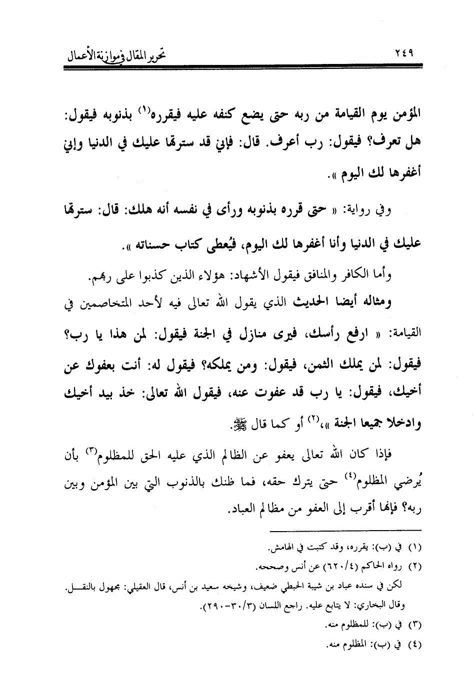 ومثاله أيضا الحديث الذي يقول الله تعالى فيه لأحد المتخاصمين في القيامة: «ارفع رأسك، فيرى منازل في الجنة فيقول: لمن هذا يا رب؟ فيقول: لمن يملك الثمن، فيقول: ومن يملكه؟ فيقول له: أنت بعفوك عن أخيك، فيقول: يا رب قد عفوت عنه، فيقول الله تعالى: خذ بيد أخيك وادخلا جميعا الجنة»، (¬2) أو كما قال - صَلَّى اللهُ عَلَيْهِ وَسَلَّمَ -.