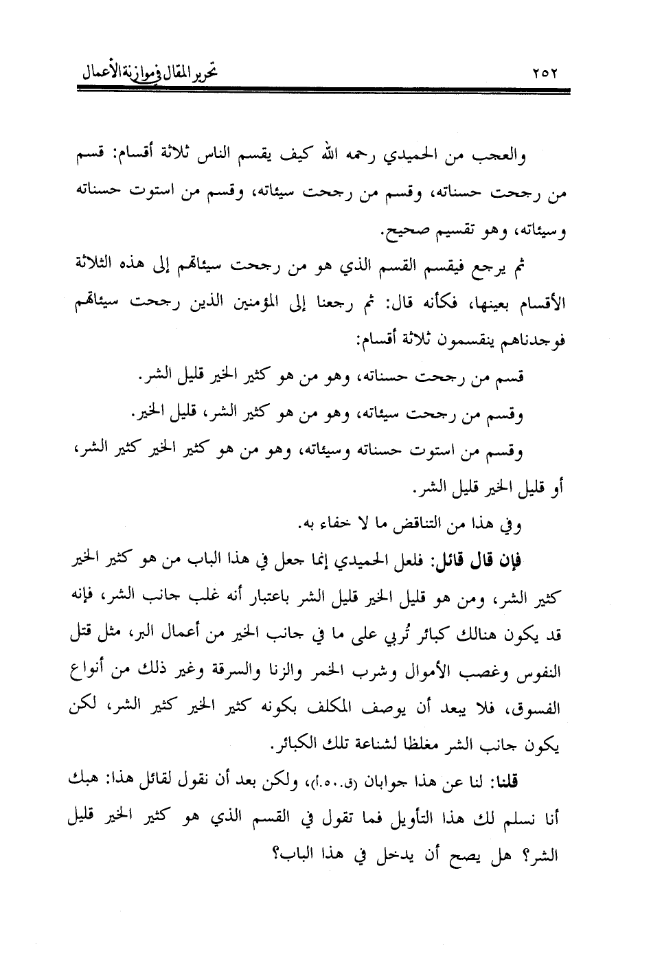 فإن قال قائل: فلعل الحميدي إنما جعل في هذا الباب من هو كثير الخير كثير الشر، ومن هو قليل الخير قليل الشر باعتبار أنه غلب جانب الشر، فإنه قد يكون هنالك كبائر تُربي على ما في جانب الخير من أعمال البر، مثل قتل النفوس وغصب الأموال وشرب الخمر والزنا والسرقة وغير ذلك من أنواع الفسوق، فلا يبعد أن يوصف المكلف بكونه كثير الخير كثير الشر، لكن يكون جانب الشر مغلظا لشناعة تلك الكبائر.