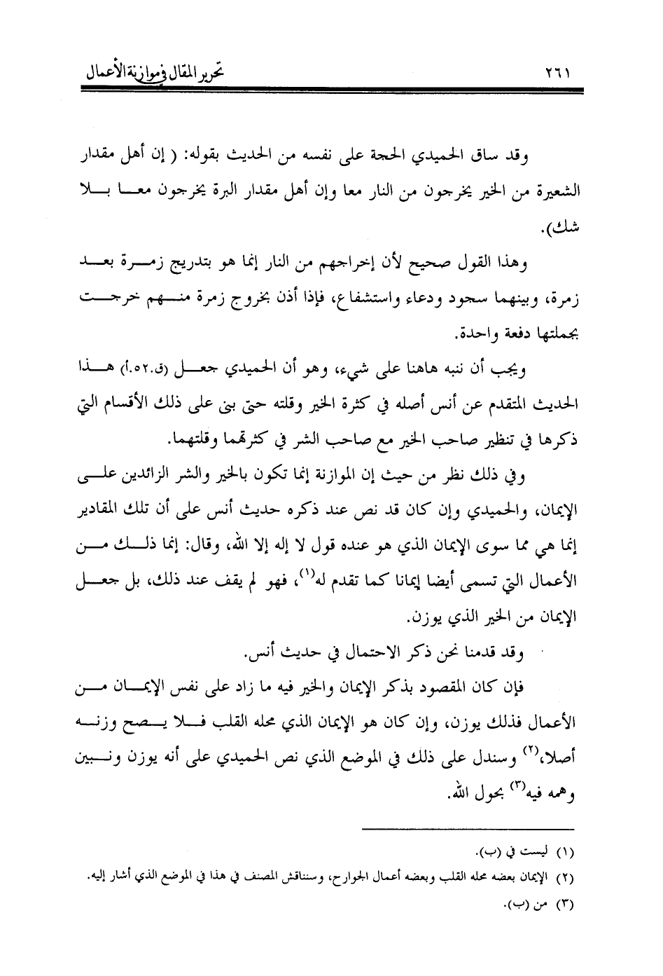فإن كان المقصود بذكر الإيمان والخير فيه ما زاد على نفس الإيمان من الأعمال فذلك يوزن، وإن كان هو الإيمان الذي محله القلب فلا يصح وزنه أصلا، (¬2) وسندل على ذلك في الموضع الذي نص الحميدي على أنه يوزن ونبين وهمه فيه (¬3) بحول الله.