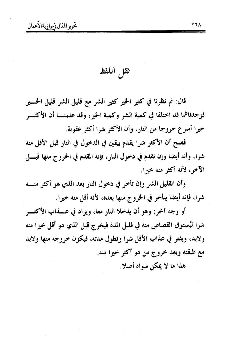 قال: ثم نظرنا في كثير الخير كثير الشر مع قليل الشر قليل الخير فوجدناهما قد اختلفا في كمية الشر وكمية الخير، وقد علمنا أن الأكثر خيرا أسرع خروجا من النار، وأن الأكثر شرا أكثر عقوبة.