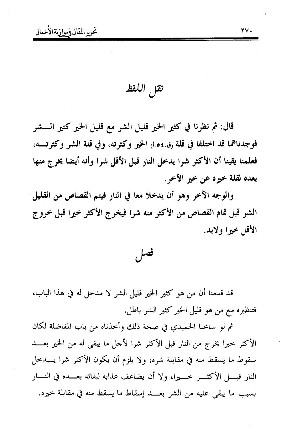 قال: ثم نظرنا في كثير الخير قليل الشر مع قليل الخير كثير الشر فوجدناهما قد اختلفا في قلة (ق.54.أ) الخير وكثرته، وفي قلة الشر وكثرته، فعلمنا يقينا أن الأكثر شرا يدخل النار قبل الأقل شرا وأنه أيضا يخرج منها بعده لقلة خيره عن خير الآخر.