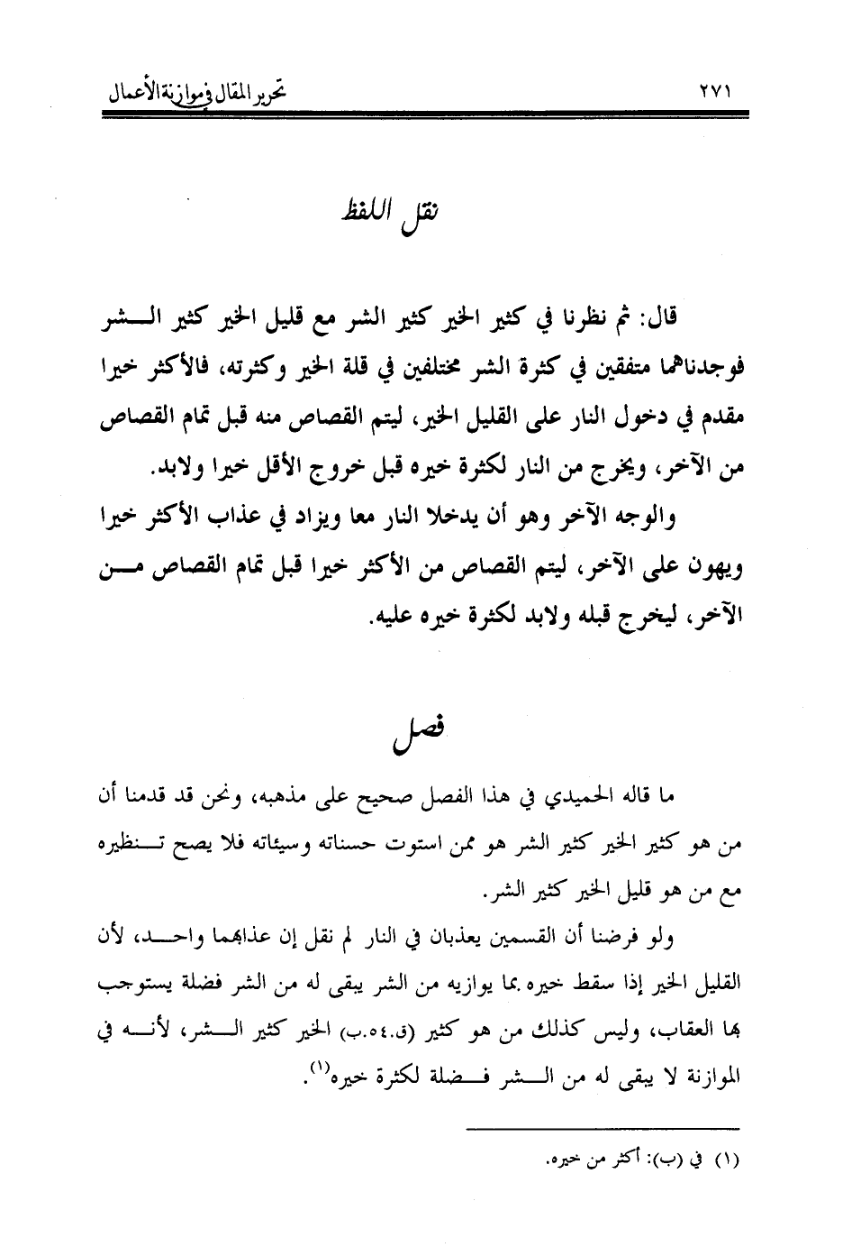 ولو فرضنا أن القسمين يعذبان في النار لم نقل إن عذابهما واحد، لأن القليل الخير إذا سقط خيره بما يوازيه من الشر يبقى له من الشر فضلة يستوجب بها العقاب، وليس كذلك من هو كثير (ق.54.ب) الخير كثير الشر، لأنه في الموازنة لا يبقى له من الشر فضلة لكثرة خيره (¬1).