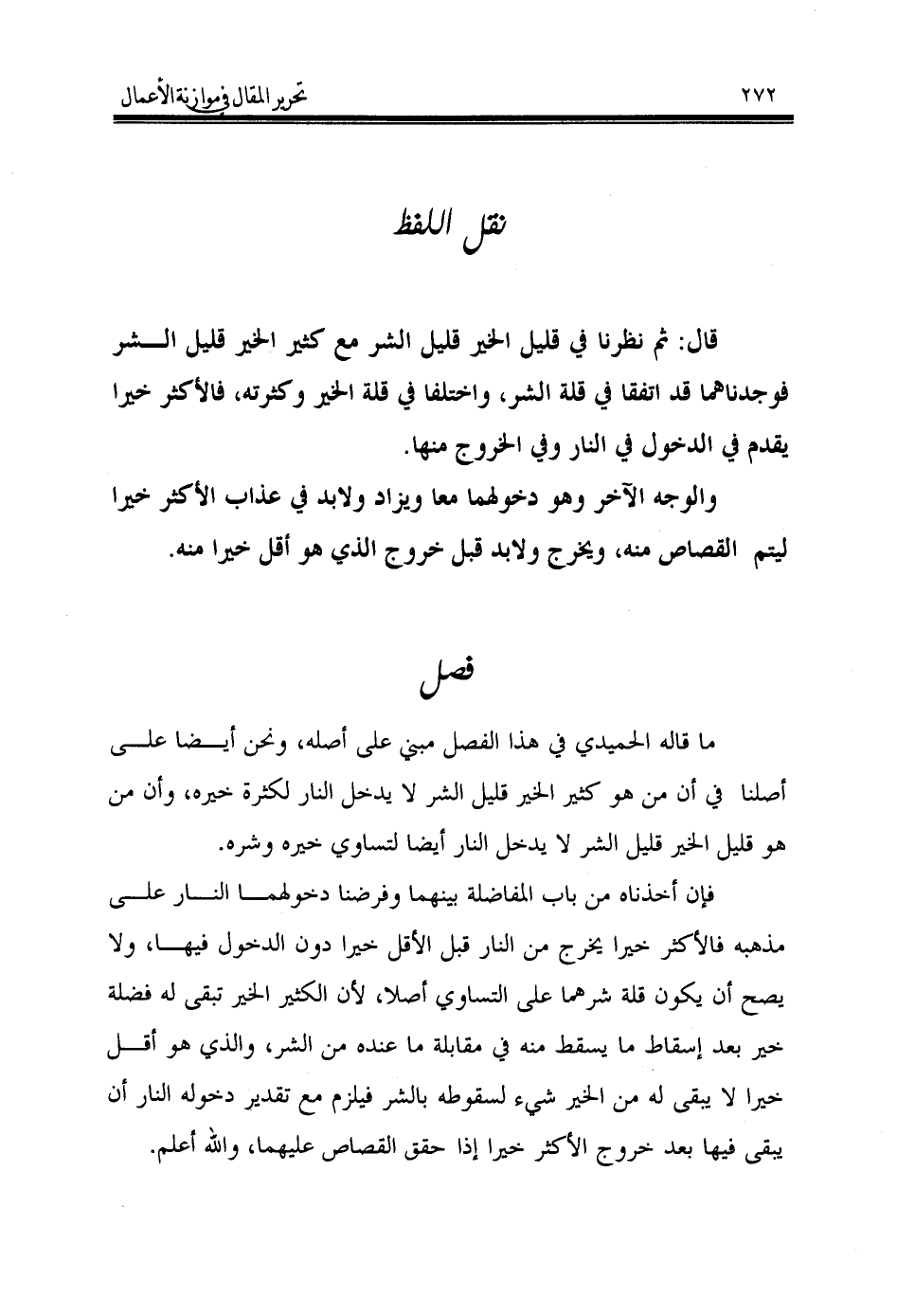 ما قاله الحميدي في هذا الفصل مبني على أصله، ونحن أيضا على أصلنا في أن من هو كثير الخير قليل الشر لا يدخل النار لكثرة خيره، وأن من هو قليل الخير قليل الشر لا يدخل النار أيضا لتساوي خيره وشره.