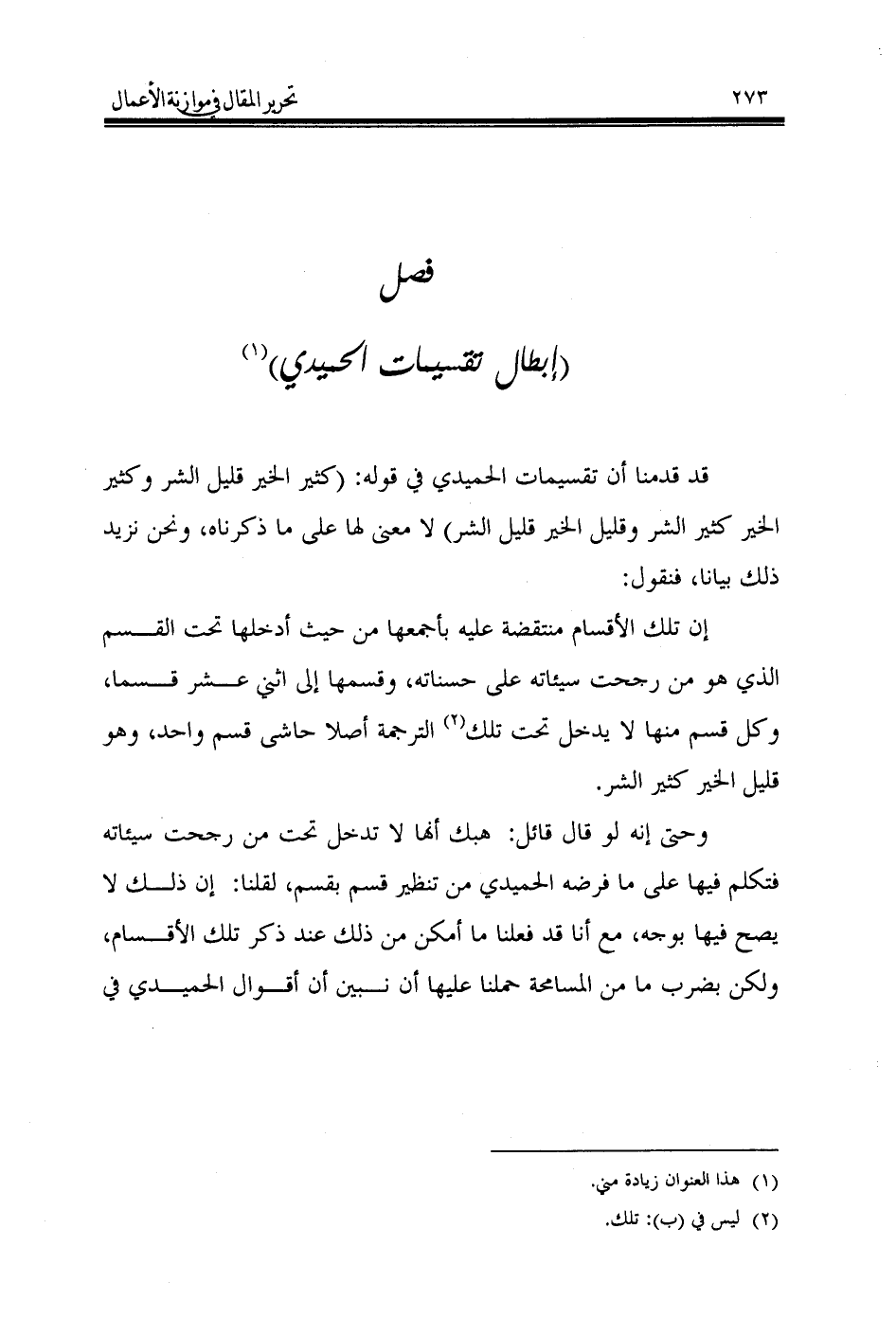 قد قدمنا أن تقسيمات الحميدي في قوله: (كثير الخير قليل الشر وكثير الخير كثير الشر وقليل الخير قليل الشر) لا معنى لها على ما ذكرناه، ونحن نزيد ذلك بيانا، فنقول: