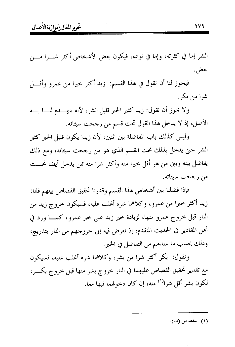 وليس كذلك باب المفاضلة بين اثنين، لأن زيدا يكون قليل الخير كثير الشر حتى يدخل بذلك تحت القسم الذي هو من رجحت سيئاته، ومع ذلك يفاضل بينه وبين من هو أقل خيرا منه وأكثر شرا منه ممن يدخل أيضا تحت من رجحت سيئاته.