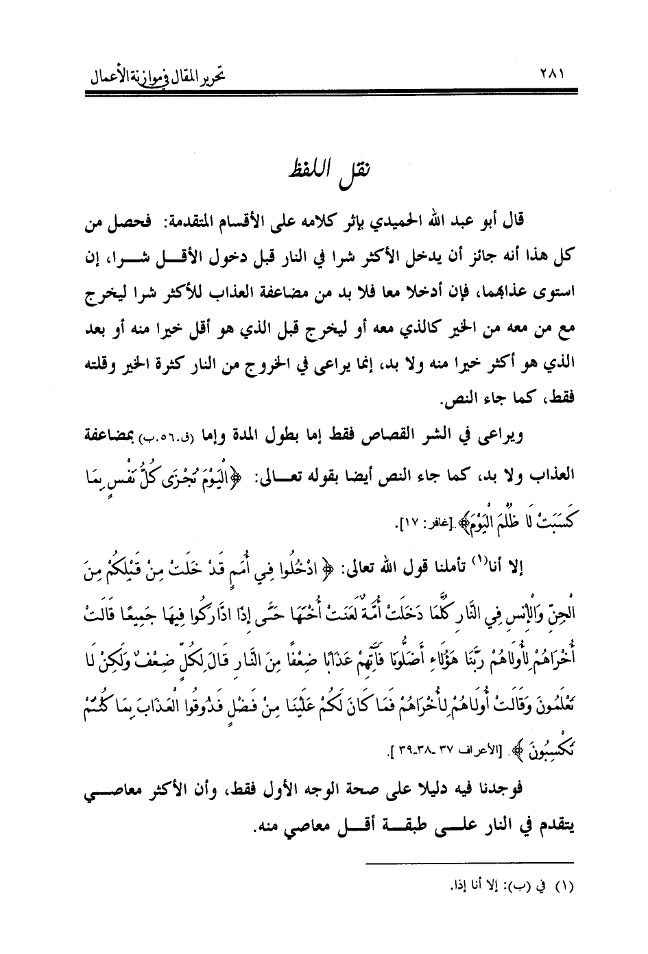قال أبو عبد الله الحميدي بإثر كلامه على الأقسام المتقدمة: فحصل من كل هذا أنه جائز أن يدخل الأكثر شرا في النار قبل دخول الأقل شرا، إن استوى عذابهما، فإن أدخلا معا فلا بد من مضاعفة العذاب للأكثر شرا ليخرج مع من معه من الخير كالذي معه أو ليخرج قبل الذي هو أقل خيرا منه أو بعد الذي هو أكثر خيرا منه ولا بد، إنما يراعى في الخروج من النار كثرة الخير وقلته فقط، كما جاء النص.
