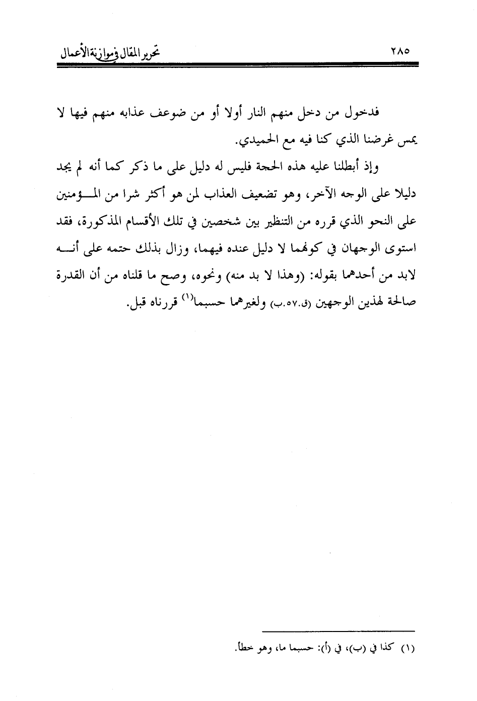 وإذ أبطلنا عليه هذه الحجة فليس له دليل على ما ذكر كما أنه لم يجد دليلا على الوجه الآخر، وهو تضعيف العذاب لمن هو أكثر شرا من المؤمنين على النحو الذي قرره من التنظير بين شخصين في تلك الأقسام المذكورة، فقد استوى الوجهان في كونهما لا دليل عنده فيهما، وزال بذلك حتمه على أنه لابد من أحدهما بقوله: (وهذا لا بد منه) ونحوه، وصح ما قلناه من أن القدرة صالحة لهذين الوجهين (ق.57.ب) ولغيرهما حسبما (¬1) قررناه قبل.