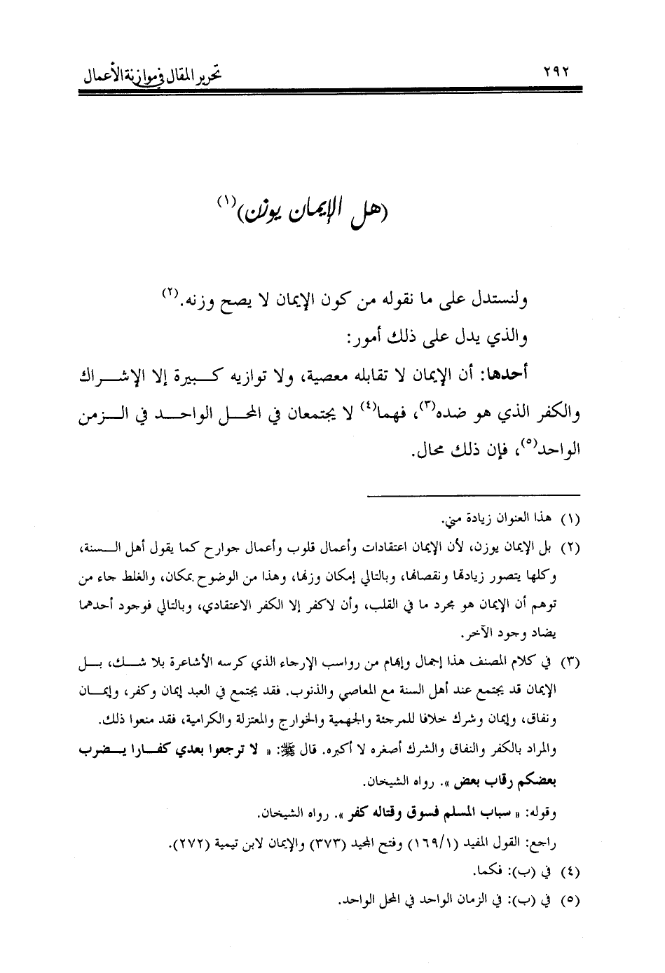 (¬2) بل الإيمان يوزن, لأن الإيمان اعتقادات وأعمال قلوب وأعمال جوارح كما يقول أهل السنة, وكلها يتصور زيادتها ونقصانها, وبالتالي إمكان وزنها، وهذا من الوضوح بمكان، والغلط جاء من توهم أن الإيمان هو مجرد ما في القلب، وأن لاكفر إلا الكفر الاعتقادي، وبالتالي فوجود أحدهما يضاد وجود الآخر.