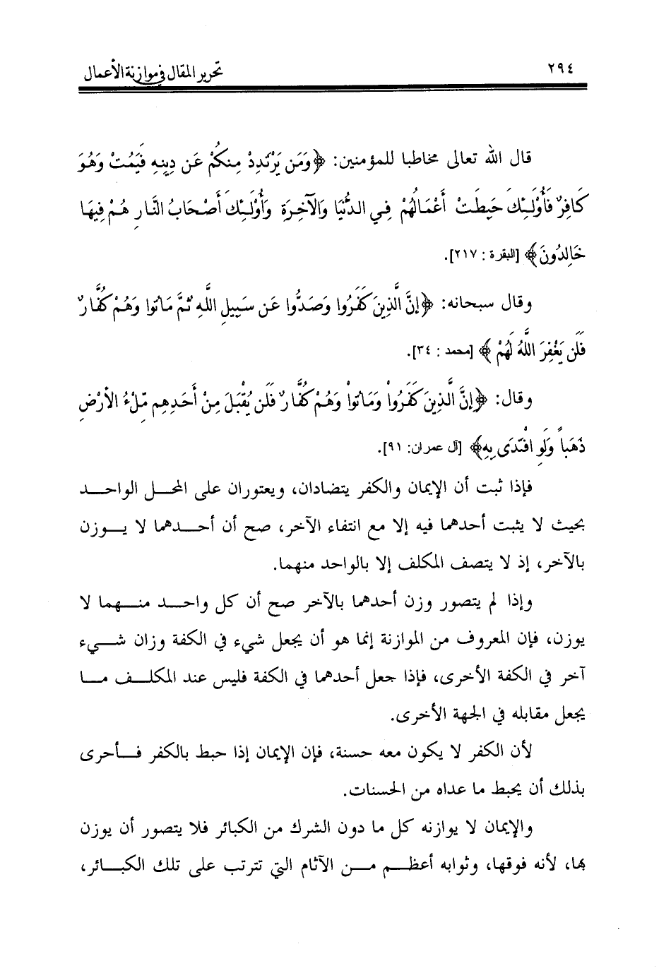 فإذا ثبت أن الإيمان والكفر يتضادان، ويعتوران على المحل الواحد بحيث لا يثبت أحدهما فيه إلا مع انتفاء الآخر، صح أن أحدهما لا يوزن بالآخر، إذ لا يتصف المكلف إلا بالواحد منهما.