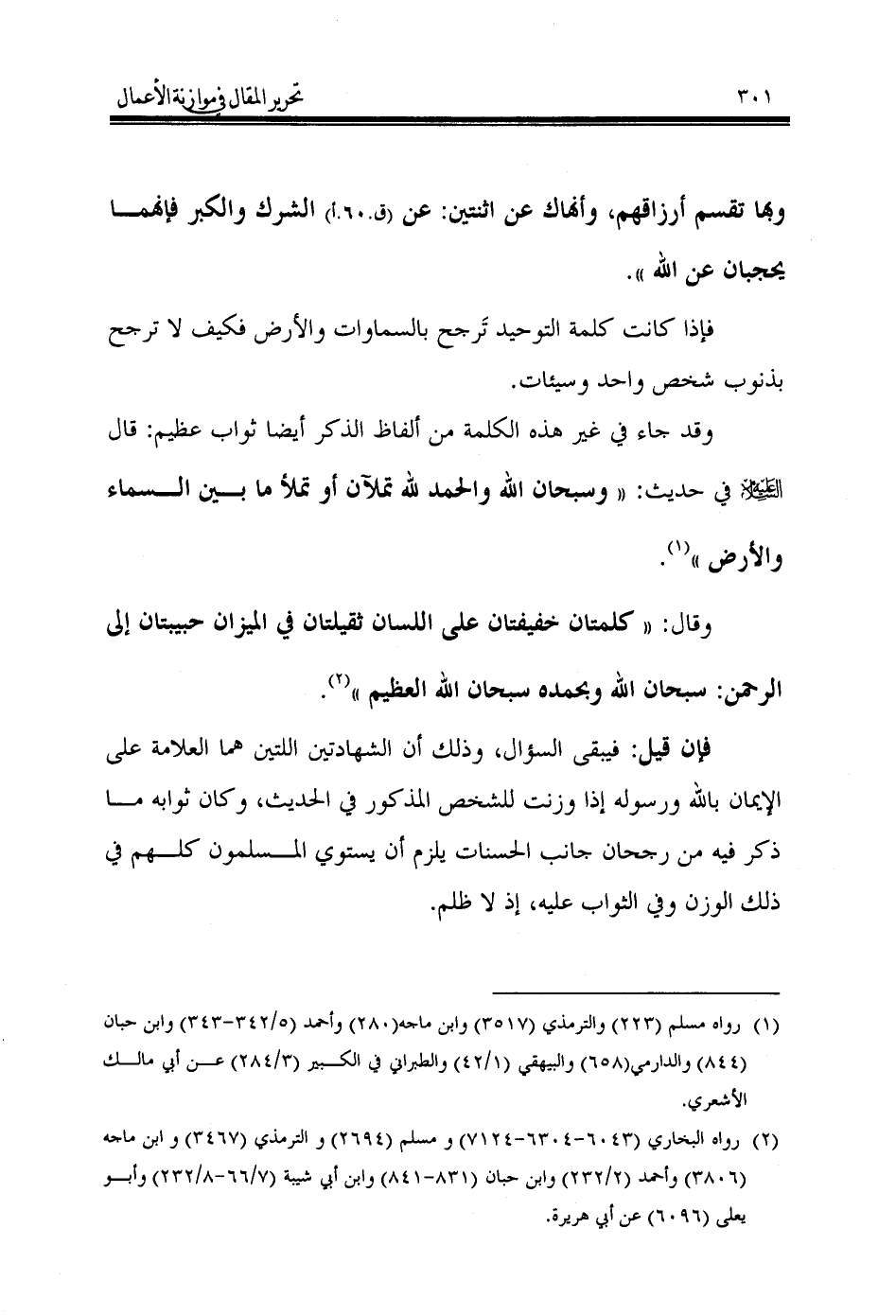فإن قيل: فيبقى السؤال، وذلك أن الشهادتين اللتين هما العلامة على الإيمان بالله ورسوله إذا وزنت للشخص المذكور في الحديث، وكان ثوابه ما ذكر فيه من رجحان جانب الحسنات يلزم أن يستوي المسلمون كلهم في ذلك الوزن وفي الثواب عليه، إذ لا ظلم.