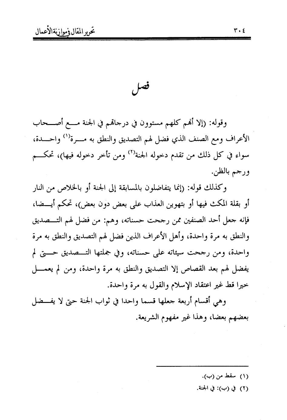 وقوله: (إلا أنهم كلهم مستوون في درجاتهم في الجنة مع أصحاب الأعراف ومع الصنف الذي فضل لهم التصديق والنطق به مرة (¬1) واحدة، سواء في كل ذلك من تقدم دخوله الجنة (¬2) ومن تأخر دخوله فيها)، تحكم ورجم بالظن.