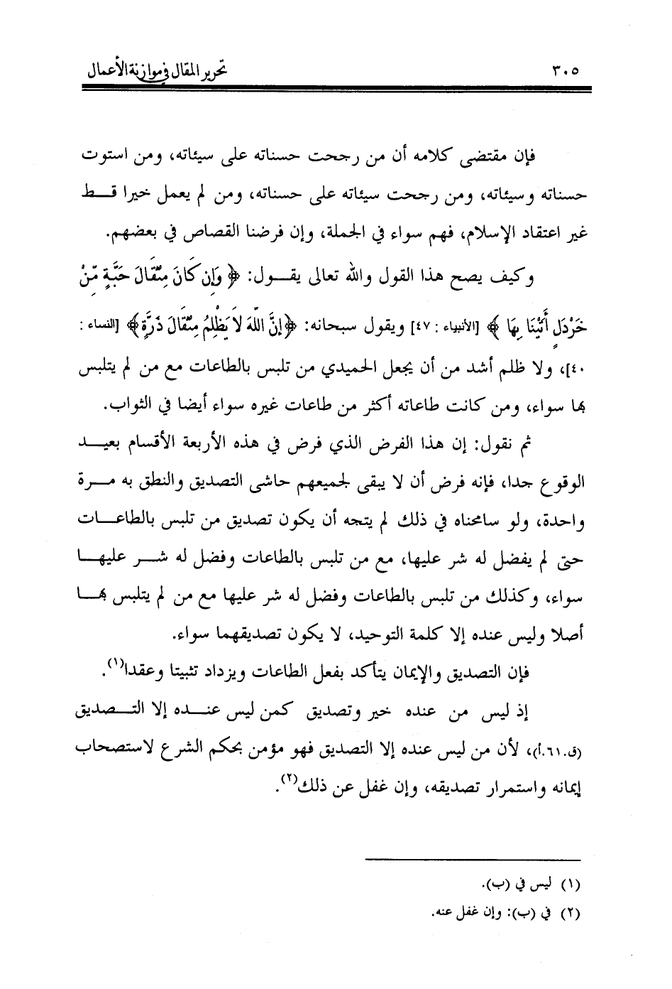 وكيف يصح هذا القول والله تعالى يقول: {وَإِن كَانَ مِثْقَالَ حَبَّةٍ مِّنْ خَرْدَلٍ أَتَيْنَا بِهَا} [الأنبياء: 47] ويقول سبحانه: {إنَّ اللهَ لاَ يَظْلِمُ مِثْقَالَ ذَرَّةٍ} [النساء: 40]، ولا ظلم أشد من أن يجعل الحميدي من تلبس بالطاعات مع من لم يتلبس بها سواء، ومن كانت طاعاته أكثر من طاعات غيره سواء أيضا في الثواب.
