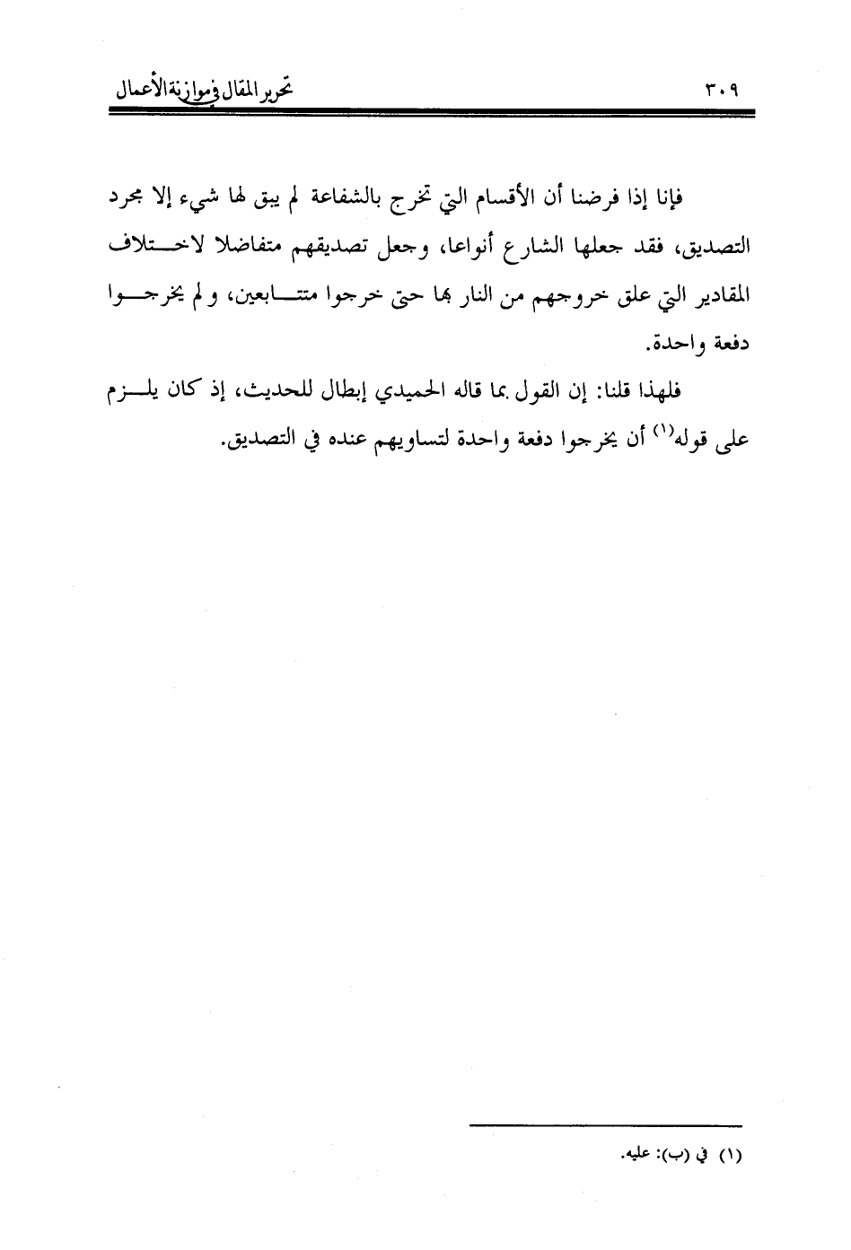 فإنا إذا فرضنا أن الأقسام التي تخرج بالشفاعة لم يبق لها شيء إلا مجرد التصديق، فقد جعلها الشارع أنواعا، وجعل تصديقهم متفاضلا لاختلاف المقادير التي علق خروجهم من النار بها حتى خرجوا متتابعين، ولم يخرجوا دفعة واحدة.