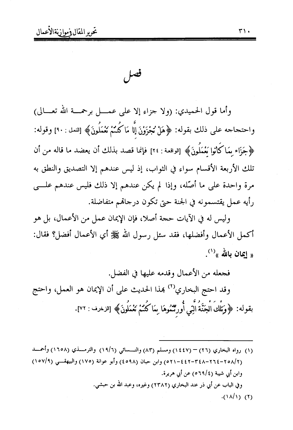 وأما قول الحميدي: (ولا جزاء إلا على عمل برحمة الله تعالى) واحتجاجه على ذلك بقوله: {هَلْ تُجْزَوْنَ إِلَّا مَا كُنتُمْ تَعْمَلُونَ} [النمل: 90] وقوله: {جَزَاء بِمَا كَانُوا يَعْمَلُونَ} [الواقعة: 24] فإنما قصد بذلك أن يعضد ما قاله من أن تلك الأربعة الأقسام سواء في الثواب، إذ ليس عندهم إلا التصديق والنطق به مرة واحدة على ما أصّله، وإذا لم يكن عندهم إلا ذلك فليس عندهم على رأيه عمل يقتسمونه في الجنة حتى تكون درجاتهم متفاضلة.