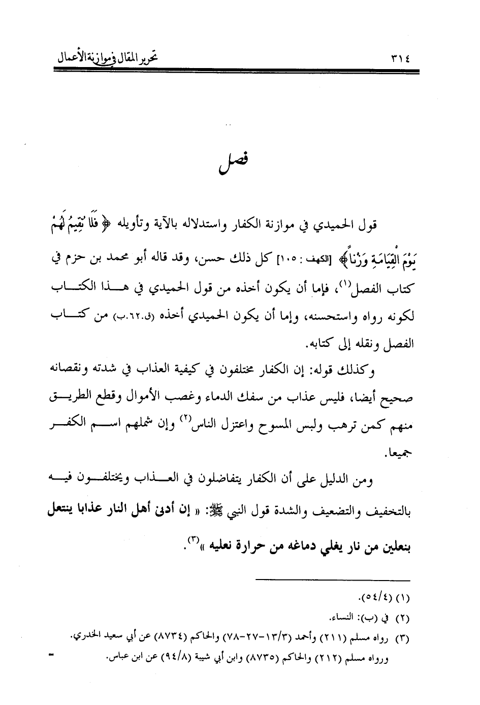 قول الحميدي في موازنة الكفار واستدلاله بالآية وتأويله {فَلَا نُقِيمُ لَهُمْ يَوْمَ الْقِيَامَةِ وَزْناً} ... [الكهف: 105] كل ذلك حسن، وقد قاله أبو محمد بن حزم في كتاب الفصل (¬1)، فإما أن يكون أخذه من قول الحميدي في هذا الكتاب لكونه رواه واستحسنه، وإما أن يكون الحميدي أخذه (ق.62.ب) من كتاب الفصل ونقله إلى كتابه.