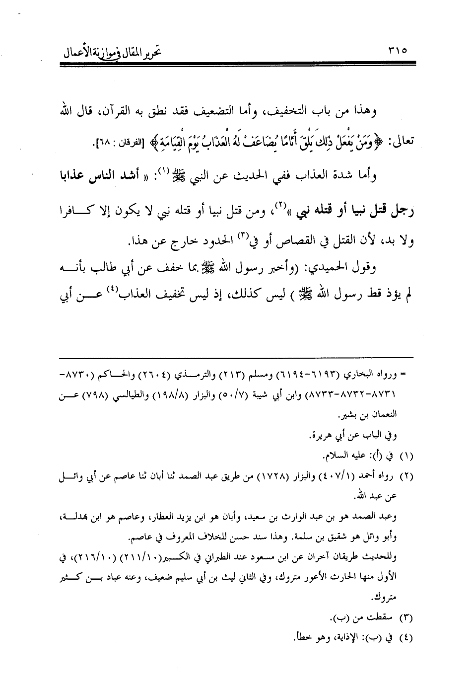 وأما شدة العذاب ففي الحديث عن النبي - صَلَّى اللهُ عَلَيْهِ وَسَلَّمَ - (¬1): «أشد الناس عذابا رجل قتل نبيا أو قتله نبي» (¬2)، ومن قتل نبيا أو قتله نبي لا يكون إلا كافرا ولا بد، لأن القتل في القصاص أو في (¬3) الحدود خارج عن هذا.
