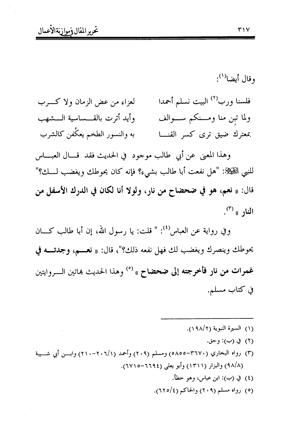 وهذا المعنى عن أبي طالب موجود في الحديث فقد قال العباس للنبي - عليه السلام -: "هل نفعت أبا طالب بشيء؟ فإنه كان يحوطك ويغضب لك؟ " قال: «نعم، هو في ضحضاح من نار، ولولا أنا لكان في الدرك الأسفل من النار» (¬3).