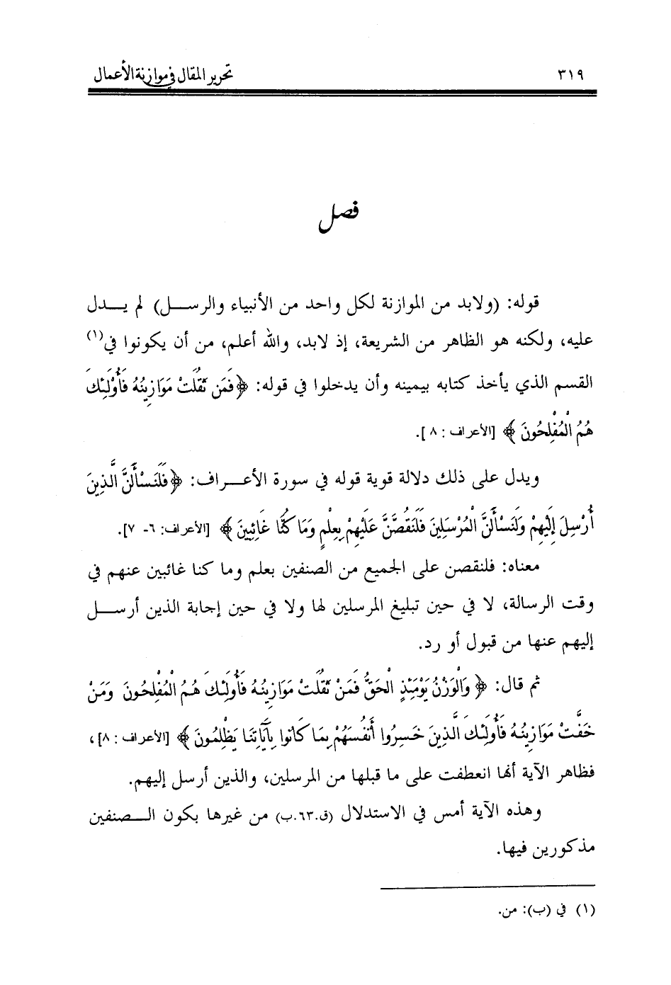 قوله: (ولابد من الموازنة لكل واحد من الأنبياء والرسل) لم يدل عليه، ولكنه هو الظاهر من الشريعة، إذ لابد، والله أعلم، من أن يكونوا في (¬1) القسم الذي يأخذ كتابه بيمينه وأن يدخلوا في قوله: {فَمَن ثَقُلَتْ مَوَازِينُهُ فَأُوْلَئِكَ هُمُ الْمُفْلِحُونَ} [الأعراف: 8].