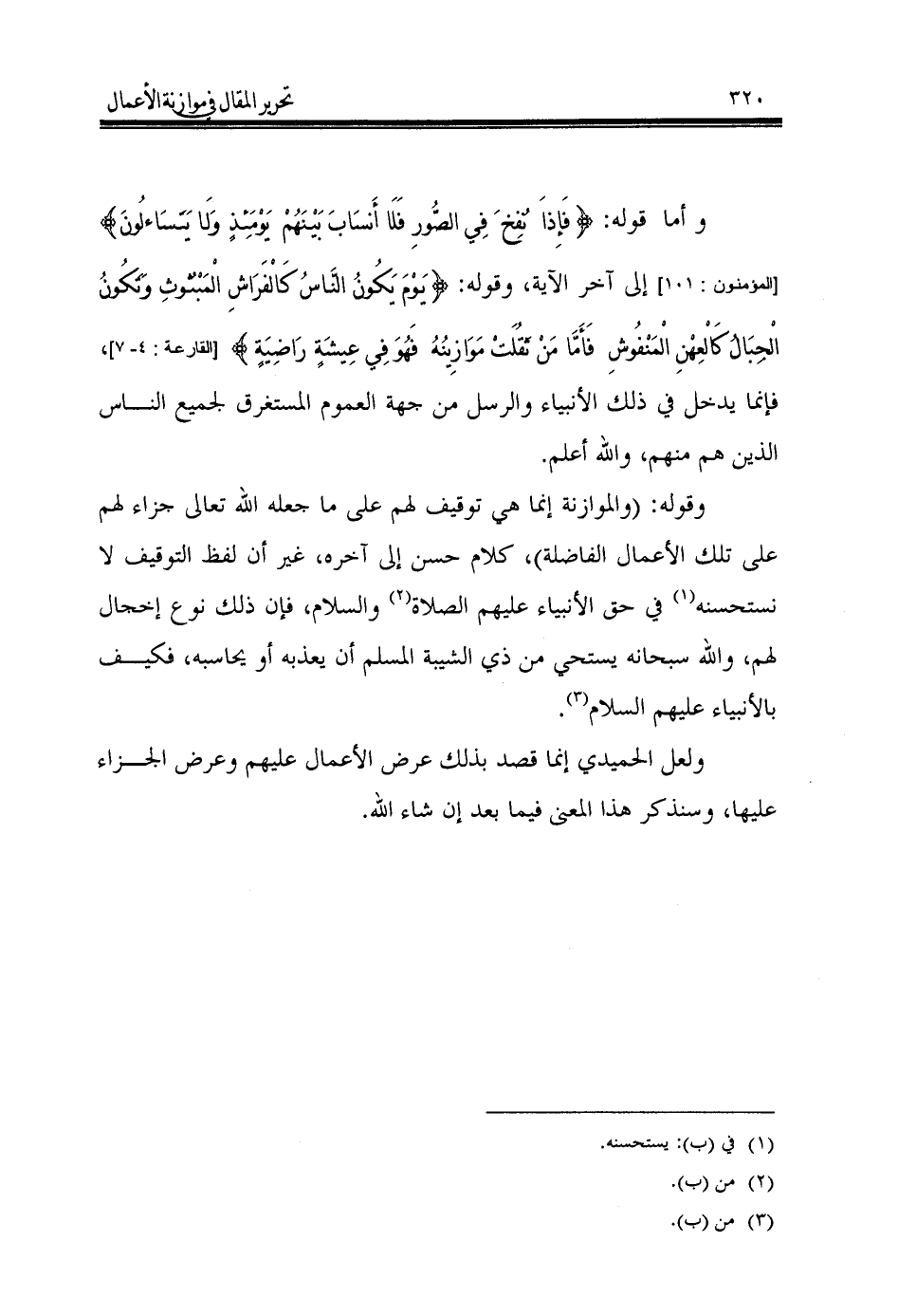 وقوله: (والموازنة إنما هي توقيف لهم على ما جعله الله تعالى جزاء لهم على تلك الأعمال الفاضلة)، كلام حسن إلى آخره، غير أن لفظ التوقيف لا نستحسنه (¬1) في حق الأنبياء عليهم الصلاة (¬2) والسلام، فإن ذلك نوع إخجال لهم، والله سبحانه يستحي من ذي الشيبة المسلم أن يعذبه أو يحاسبه، فكيف بالأنبياء عليهم السلام (¬3).