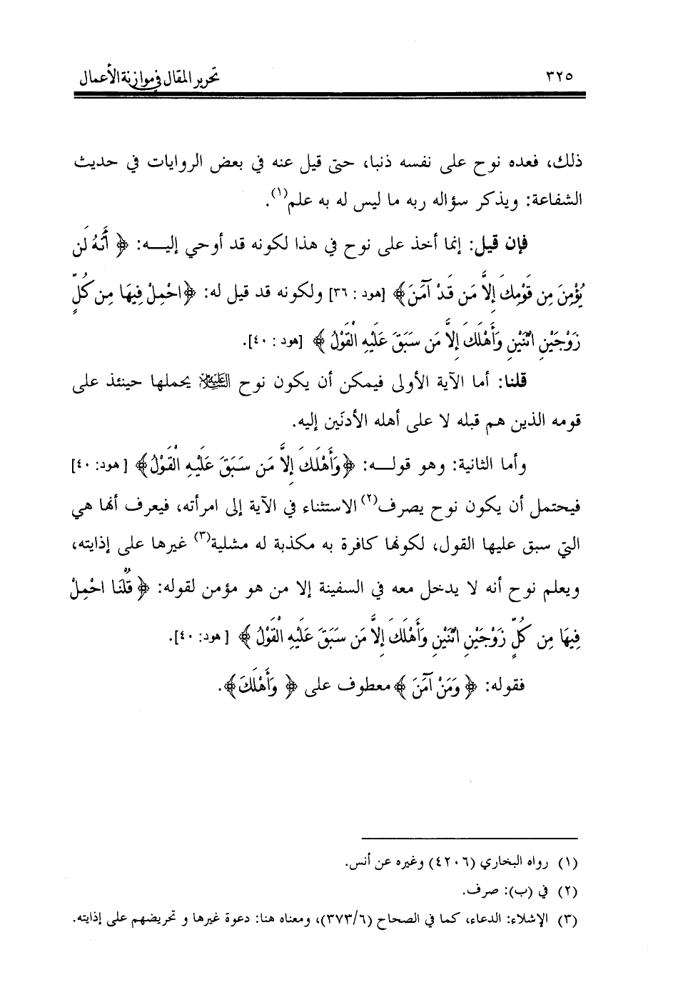 وأما الثانية: وهو قوله: {وَأَهْلَكَ إِلاَّ مَن سَبَقَ عَلَيْهِ الْقَوْلُ} [هود: 40] فيحتمل أن يكون نوح يصرف (¬2) الاستثناء في الآية إلى امرأته، فيعرف أنها هي التي سبق عليها القول، لكونها كافرة به مكذبة له مشلية (¬3) غيرها على إذايته، ويعلم نوح أنه لا يدخل معه في السفينة إلا من هو مؤمن لقوله: {قُلْنَا احْمِلْ فِيهَا مِن كُلٍّ زَوْجَيْنِ اثْنَيْنِ وَأَهْلَكَ إِلاَّ مَن سَبَقَ عَلَيْهِ الْقَوْلُ} [هود: 40].