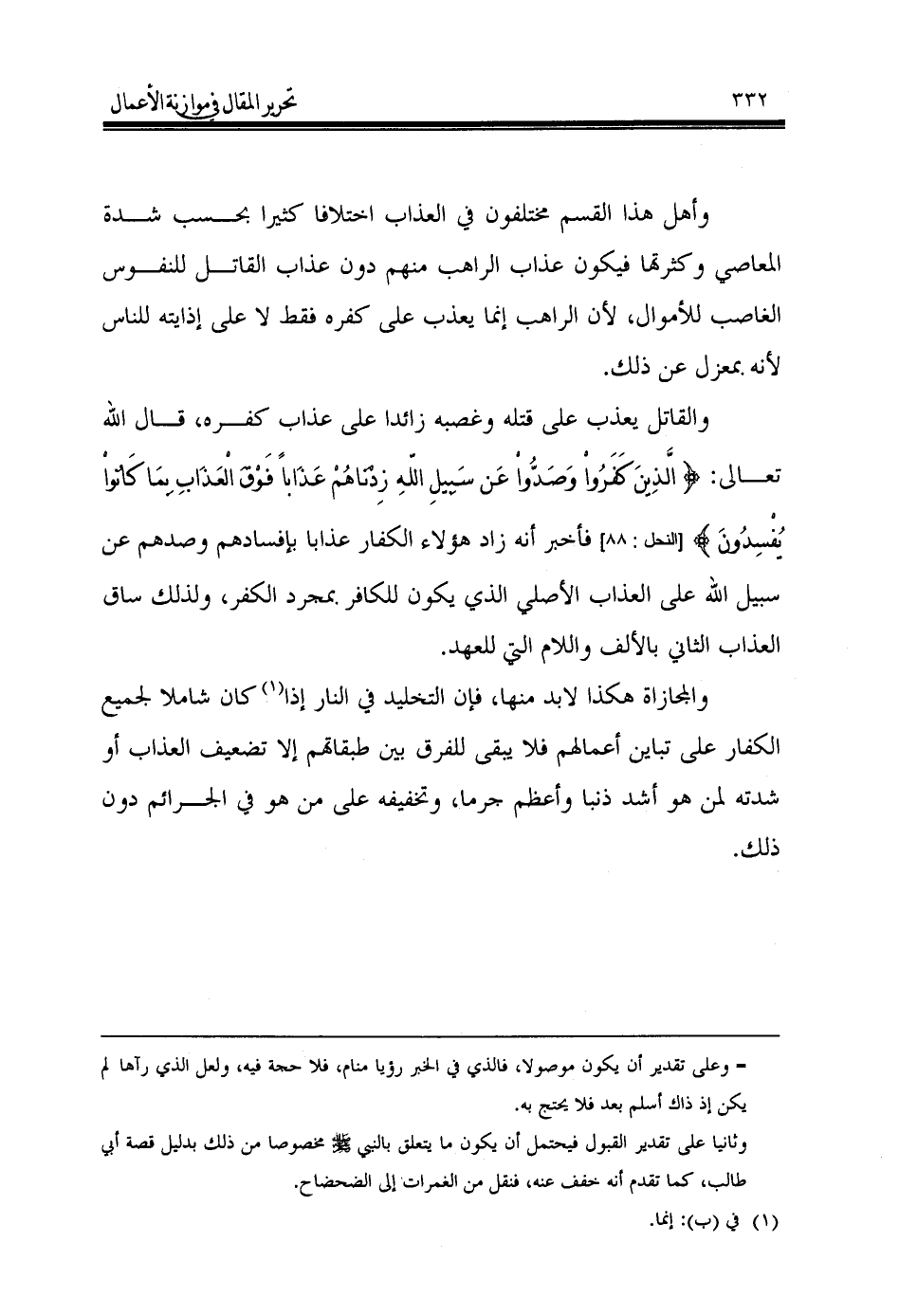 وأهل هذا القسم مختلفون في العذاب اختلافا كثيرا بحسب شدة المعاصي وكثرتها فيكون عذاب الراهب منهم دون عذاب القاتل للنفوس الغاصب للأموال، لأن الراهب إنما يعذب على كفره فقط لا على إذايته للناس لأنه بمعزل عن ذلك.