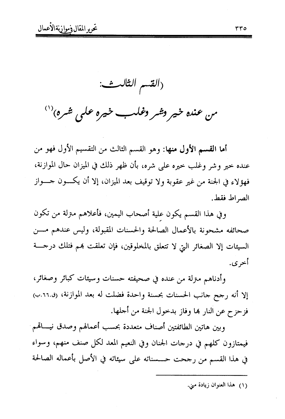 أما القسم الأول منها: وهو القسم الثالث من التقسيم الأول فهو من عنده خير وشر وغلب خيره على شره، بأن ظهر ذلك في الميزان حال الموازنة، فهؤلاء في الجنة من غير عقوبة ولا توقيف بعد الميزان، إلا أن يكون جواز الصراط فقط.