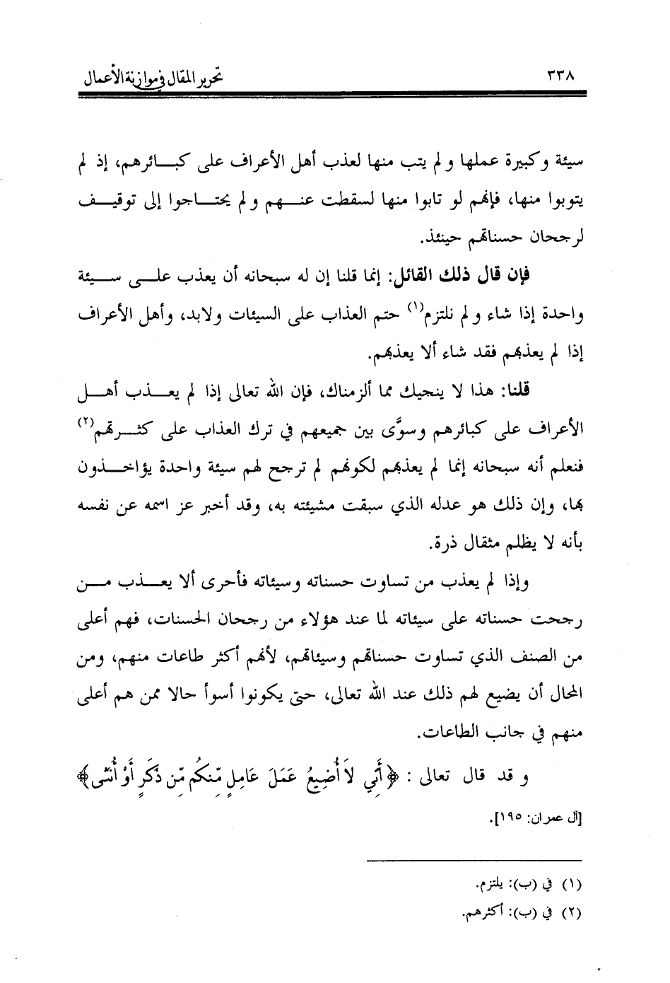 وإذا لم يعذب من تساوت حسناته وسيئاته فأحرى ألا يعذب من رجحت حسناته على سيئاته لما عند هؤلاء من رجحان الحسنات، فهم أعلى من الصنف الذي تساوت حسناتهم وسيئاتهم، لأنهم أكثر طاعات منهم، ومن المحال أن يضيع لهم ذلك عند الله تعالى، حتى يكونوا أسوأ حالا ممن هم أعلى منهم في جانب الطاعات.