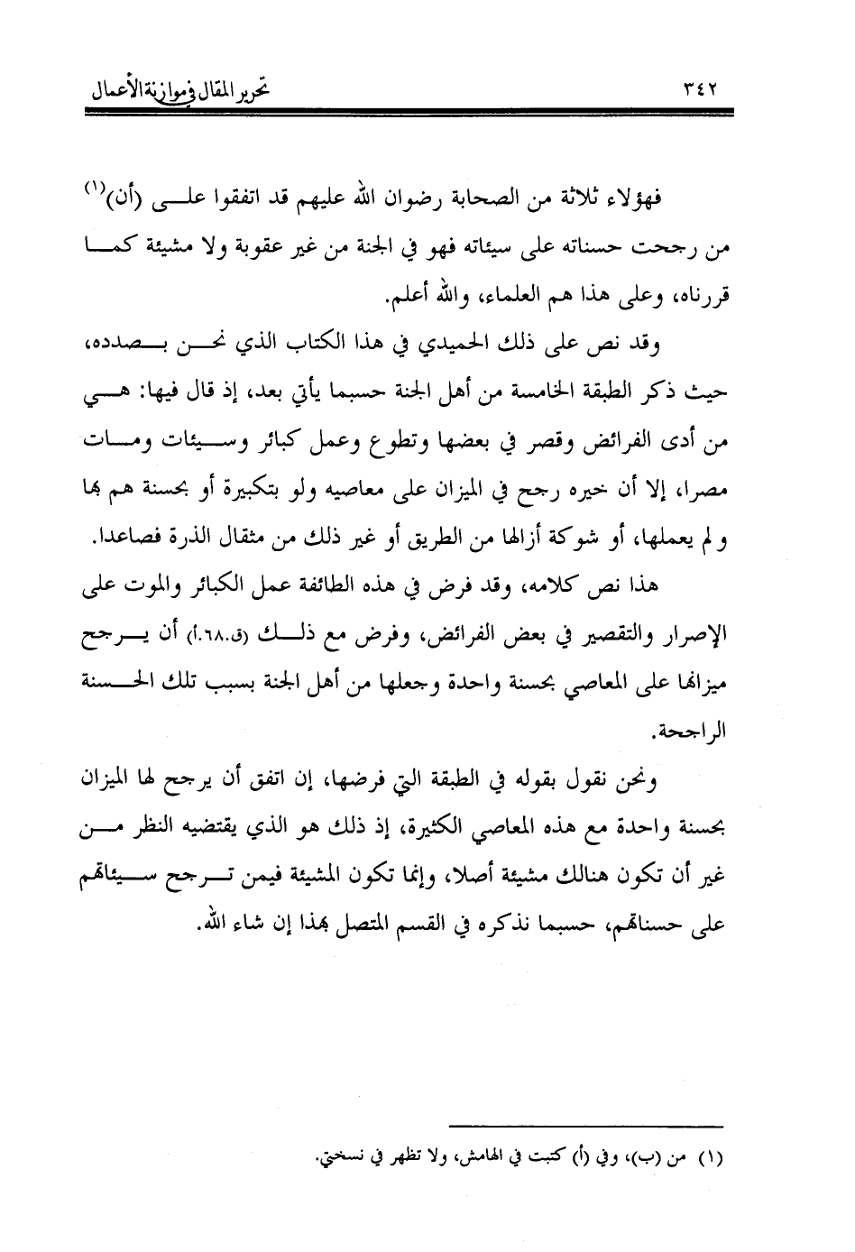 وقد نص على ذلك الحميدي في هذا الكتاب الذي نحن بصدده، حيث ذكر الطبقة الخامسة من أهل الجنة حسبما يأتي بعد، إذ قال فيها: هي من أدى الفرائض وقصر في بعضها وتطوع وعمل كبائر وسيئات ومات مصرا، إلا أن خيره رجح في الميزان على معاصيه ولو بتكبيرة أو بحسنة هم بها ولم يعملها، أو شوكة أزالها من الطريق أو غير ذلك من مثقال الذرة فصاعدا.