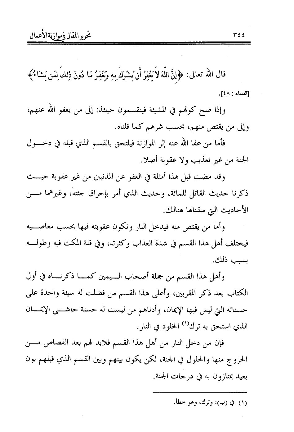 وأهل هذا القسم من جملة أصحاب اليمين كما ذكرناه في أول الكتاب بعد ذكر المقربين، وأعلى هذا القسم من فضلت له سيئة واحدة على حسناته التي ليس فيها الإيمان، وأدناهم من ليست له حسنة حاشى الإيمان الذي استحق به ترك (¬1) الخلود في النار.
