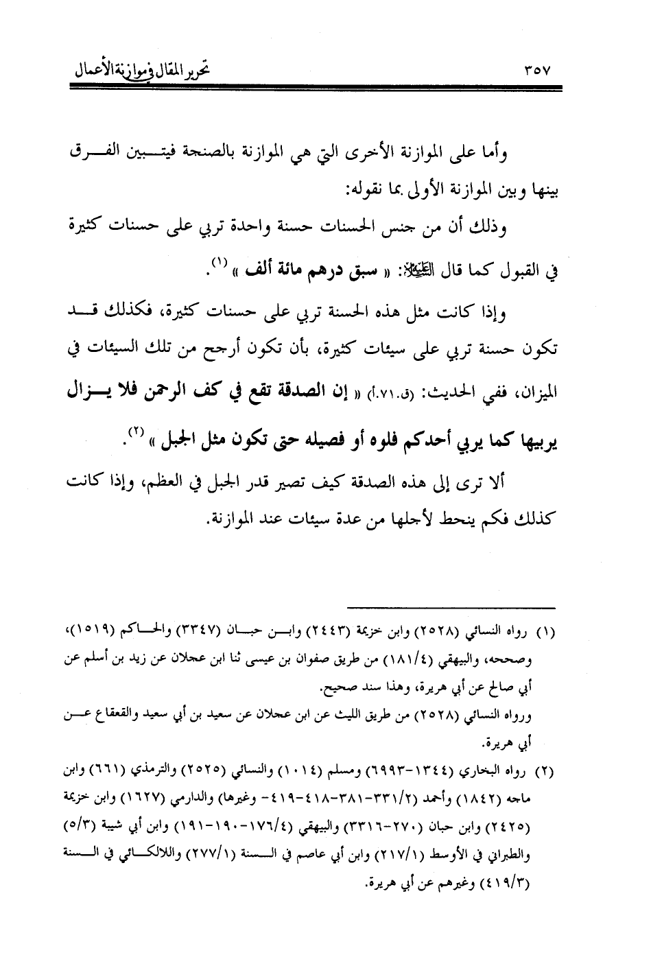 وإذا كانت مثل هذه الحسنة تربي على حسنات كثيرة، فكذلك قد تكون حسنة تربي على سيئات كثيرة، بأن تكون أرجح من تلك السيئات في الميزان، ففي الحديث: (ق.71.أ) «إن الصدقة تقع في كف الرحمن فلا يزال يربيها كما يربي أحدكم فلوه أو فصيله حتى تكون مثل الجبل» (¬2).