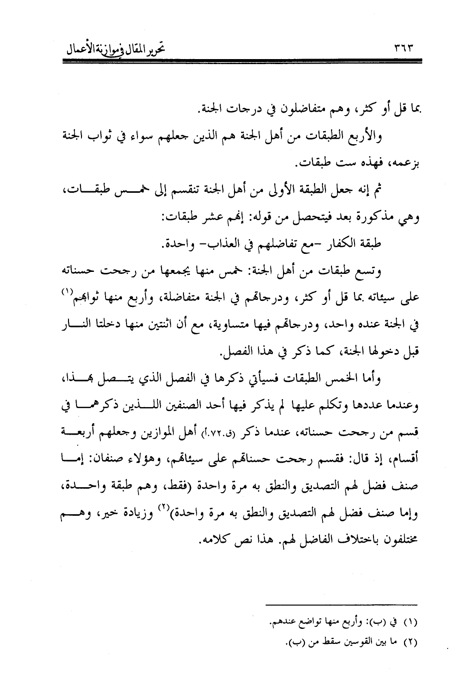 وأما الخمس الطبقات فسيأتي ذكرها في الفصل الذي يتصل بهذا، وعندما عددها وتكلم عليها لم يذكر فيها أحد الصنفين اللذين ذكرهما في قسم من رجحت حسناته، عندما ذكر (ق.72.أ) أهل الموازين وجعلهم أربعة أقسام، إذ قال: فقسم رجحت حسناتهم على سيئاتهم، وهؤلاء صنفان: إما صنف فضل لهم التصديق والنطق به مرة واحدة (فقط، وهم طبقة واحدة، وإما صنف فضل لهم التصديق والنطق به مرة واحدة) (¬2) وزيادة خير، وهم مختلفون باختلاف الفاضل لهم. هذا نص كلامه.