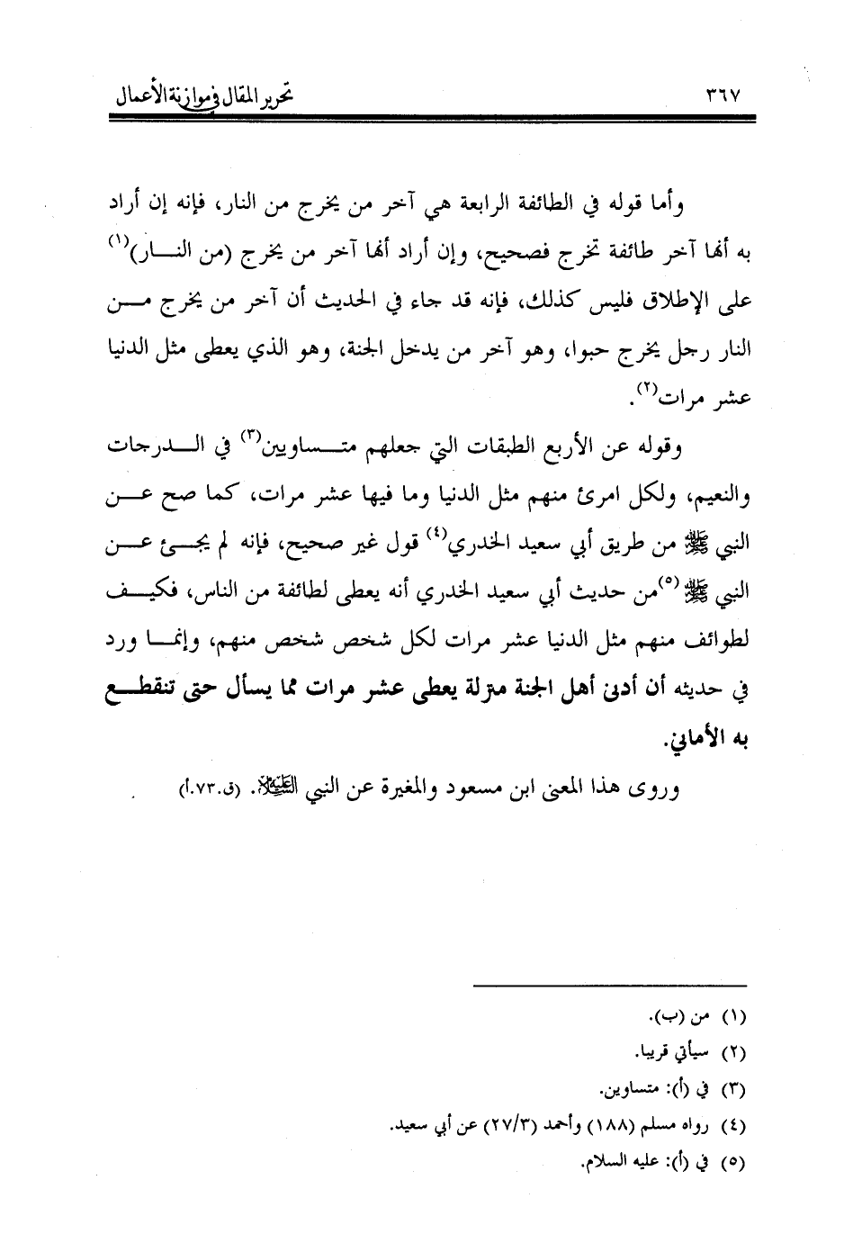 وقوله عن الأربع الطبقات التي جعلهم متساويين (¬3) في الدرجات والنعيم، ولكل امرئ منهم مثل الدنيا وما فيها عشر مرات، كما صح عن النبي - صَلَّى اللهُ عَلَيْهِ وَسَلَّمَ - من طريق أبي سعيد الخدري (¬4) قول غير صحيح، فإنه لم يجئ عن النبي - صَلَّى اللهُ عَلَيْهِ وَسَلَّمَ - (¬5) من حديث أبي سعيد الخدري أنه يعطى لطائفة من الناس، فكيف لطوائف منهم مثل الدنيا عشر مرات لكل شخص شخص منهم، وإنما ورد في حديثه أن أدنى أهل الجنة منزلة يعطى عشر مرات مما يسأل حتى تنقطع به الأماني.