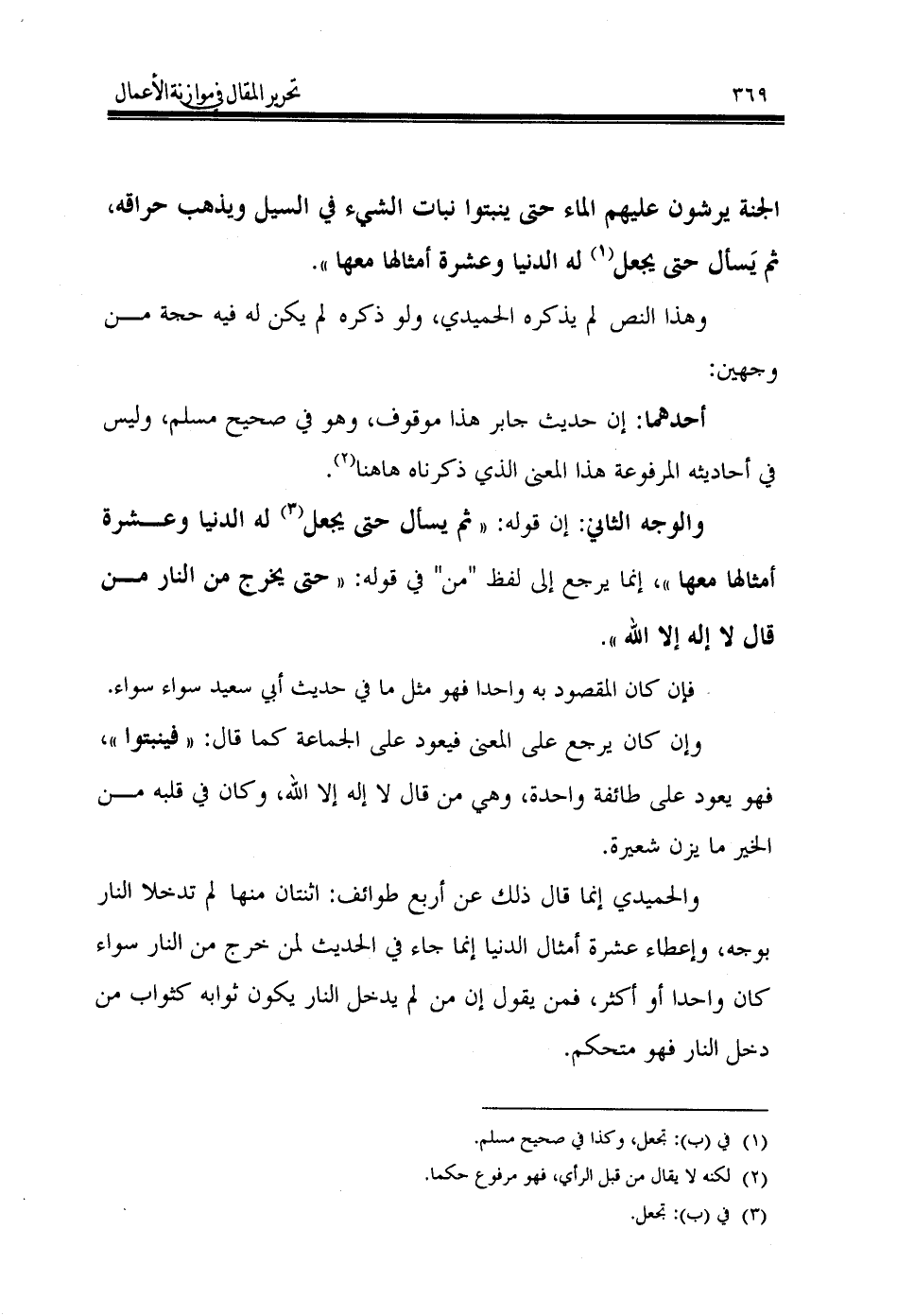 والحميدي إنما قال ذلك عن أربع طوائف: اثنتان منها لم تدخلا النار بوجه، وإعطاء عشرة أمثال الدنيا إنما جاء في الحديث لمن خرج من النار سواء كان واحدا أو أكثر، فمن يقول إن من لم يدخل النار يكون ثوابه كثواب من دخل النار فهو متحكم.