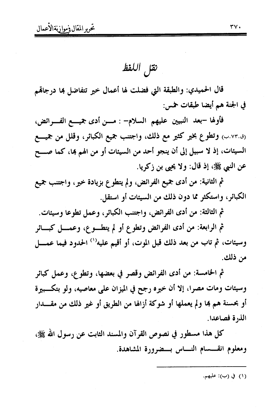 قال الحميدي: والطبقة التي فضلت لها أعمال خير تتفاضل بها درجاتهم في الجنة هم أيضا طبقات خمس: