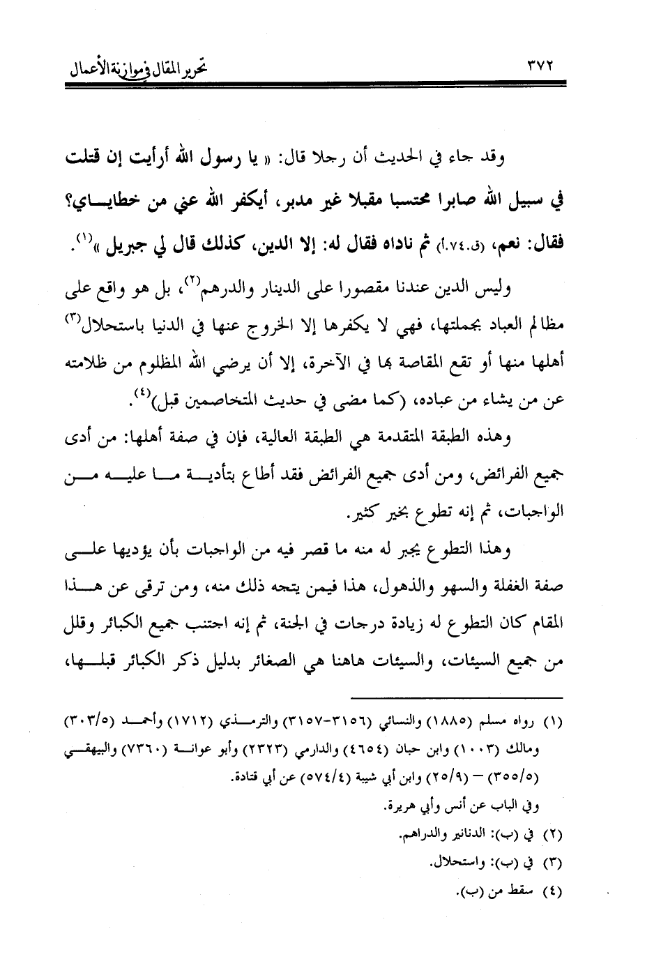 وقد جاء في الحديث أن رجلا قال: «يا رسول الله أرأيت إن قتلت في سبيل الله صابرا محتسبا مقبلا غير مدبر، أيكفر الله عني من خطاياي؟ فقال: نعم، (ق.74.أ) ثم ناداه فقال له: إلا الدين، كذلك قال لي جبريل» (¬1).