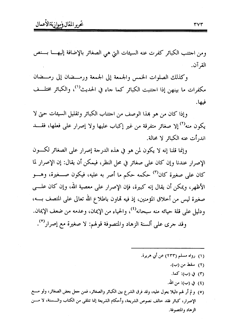 (¬5) ولم أر لهم دليلا يعول عليه، وقد فرق الشرع بين الكبائر والصغائر، فمن جعل بعض الصغائر، ولو مع الإصرار، كبائر فقد خالف نصوص الشريعة، وأحكام الشريعة إنما تتلقى من الكتاب والسنة، لا من الزهاد والمتصوفة.