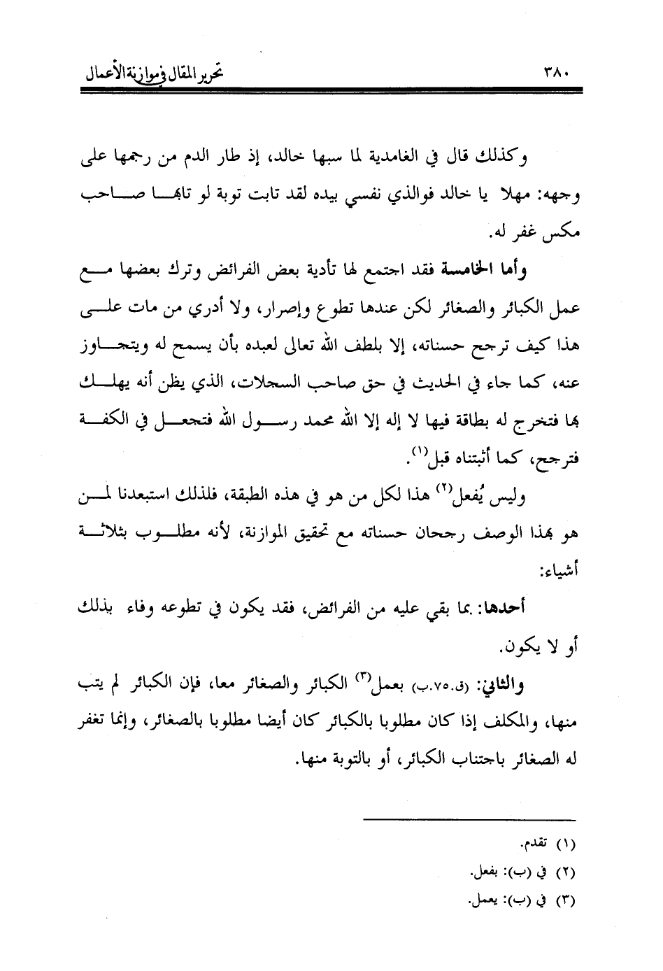 وأما الخامسة فقد اجتمع لها تأدية بعض الفرائض وترك بعضها مع عمل الكبائر والصغائر لكن عندها تطوع وإصرار، ولا أدري من مات على هذا كيف ترجح حسناته، إلا بلطف الله تعالى لعبده بأن يسمح له ويتجاوز عنه، كما جاء في الحديث في حق صاحب السجلات، الذي يظن أنه يهلك بها فتخرج له بطاقة فيها لا إله إلا الله محمد رسول الله فتجعل في الكفة فترجح، كما أثبتناه قبل (¬1).