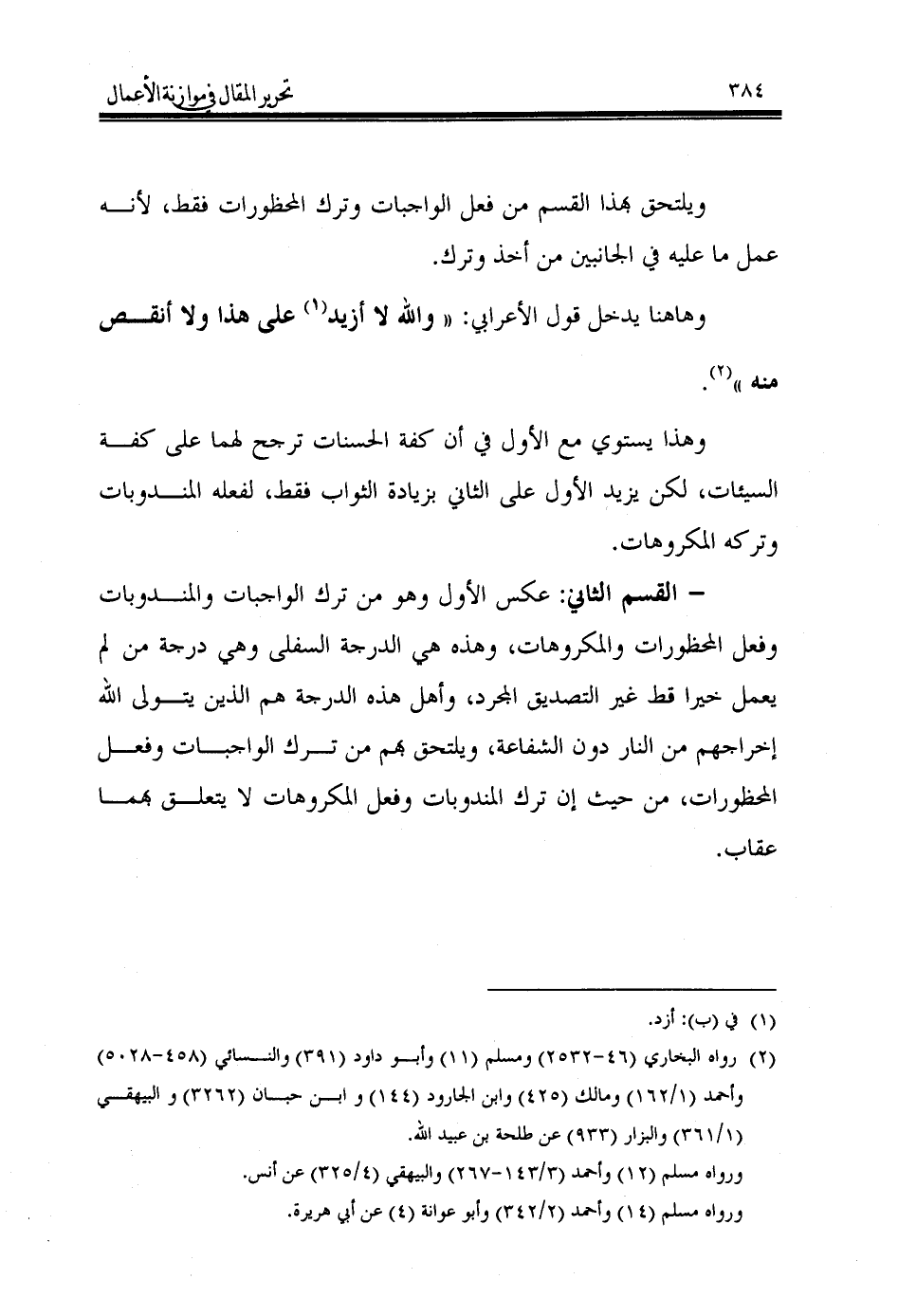 - القسم الثاني: عكس الأول وهو من ترك الواجبات والمندوبات وفعل المحظورات والمكروهات، وهذه هي الدرجة السفلى وهي درجة من لم يعمل خيرا قط غير التصديق المجرد، وأهل هذه الدرجة هم الذين يتولى الله إخراجهم من النار دون الشفاعة، ويلتحق بهم من ترك الواجبات وفعل المحظورات، من حيث إن ترك المندوبات وفعل المكروهات لا يتعلق بهما عقاب.