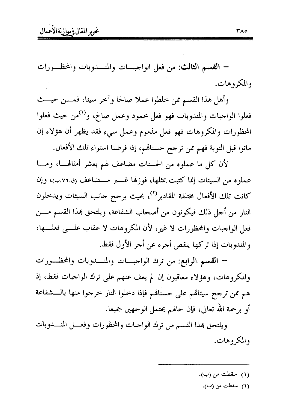 لأن كل ما عملوه من الحسنات مضاعف لهم بعشر أمثالها، وما عملوه من السيئات إنما كتبت بمثلها، فوزنها غير مضاعف (ق.76.ب)، وإن كانت تلك الأفعال مختلفة المقادير (¬2)، بحيث يرجح جانب السيئات ويدخلون النار من أجل ذلك فيكونون من أصحاب الشفاعة، ويلتحق بهذا القسم من فعل الواجبات والمحظورات لا غير، لأن المكروهات لا عقاب على فعلها، والمندوبات إذا تركها ينقص أجره عن أجر الأول فقط.