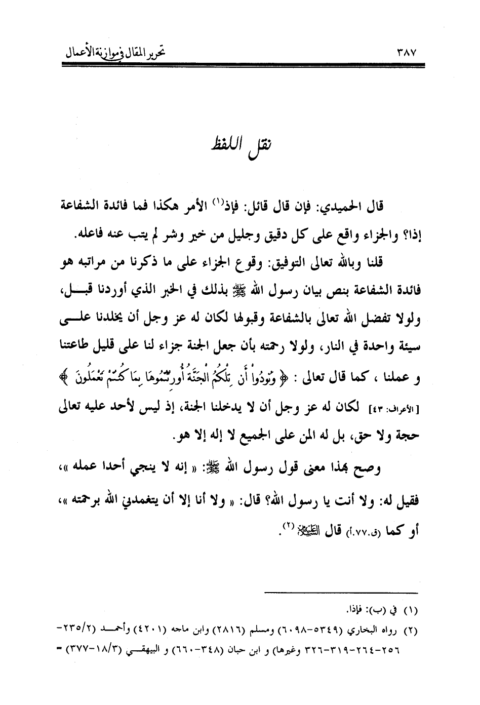 وصح بهذا معنى قول رسول الله - صَلَّى اللهُ عَلَيْهِ وَسَلَّمَ -: «إنه لا ينجي أحدا عمله»، فقيل له: ولا أنت يا رسول الله؟ قال: «ولا أنا إلا أن يتغمدني الله برحمته»، أو كما (ق.77.أ) قال - عليه السلام - (¬2).