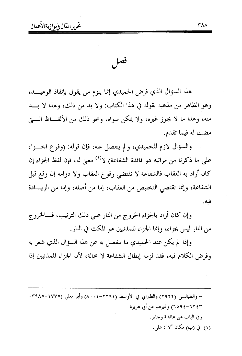 وإذا لم يكن عند الحميدي ما ينفصل به عن هذا السؤال الذي شعر به وفرض الكلام فيه، فقد لزمه إبطال الشفاعة لا محالة، لأن الجزاء للمذنبين إذا
