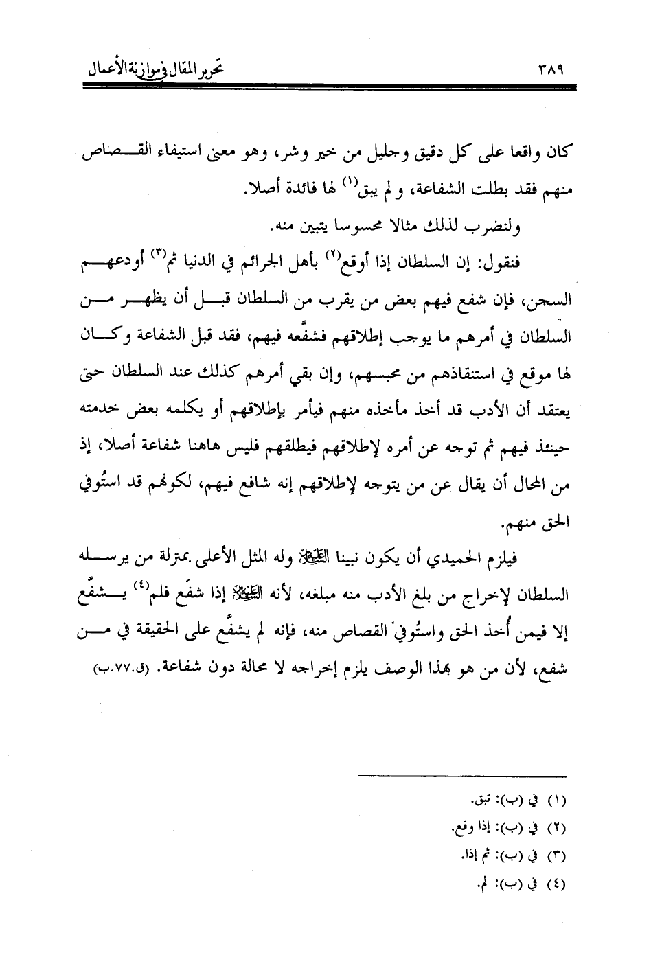فيلزم الحميدي أن يكون نبينا - عليه السلام - وله المثل الأعلى بمنزلة من يرسله السلطان لإخراج من بلغ الأدب منه مبلغه، لأنه - عليه السلام - إذا شفَع فلم (¬4) يشفَّع إلا فيمن أُخذ الحق واستُوفي القصاص منه، فإنه لم يشفَّع على الحقيقة في من شفع، لأن من هو بهذا الوصف يلزم إخراجه لا محالة دون شفاعة. (ق.77.ب)