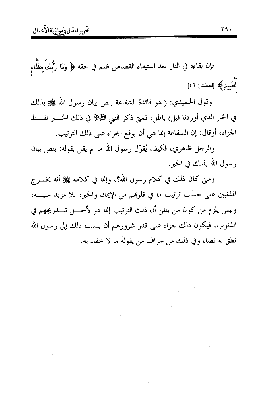 وقول الحميدي: (هو فائدة الشفاعة بنص بيان رسول الله - صَلَّى اللهُ عَلَيْهِ وَسَلَّمَ - بذلك في الخبر الذي أوردنا قبل) باطل، فمتى ذكر النبي - عليه السلام - في ذلك الخبر لفظ الجزاء، أوقال: إن الشفاعة إنما هي أن يوقع الجزاء على ذلك الترتيب.