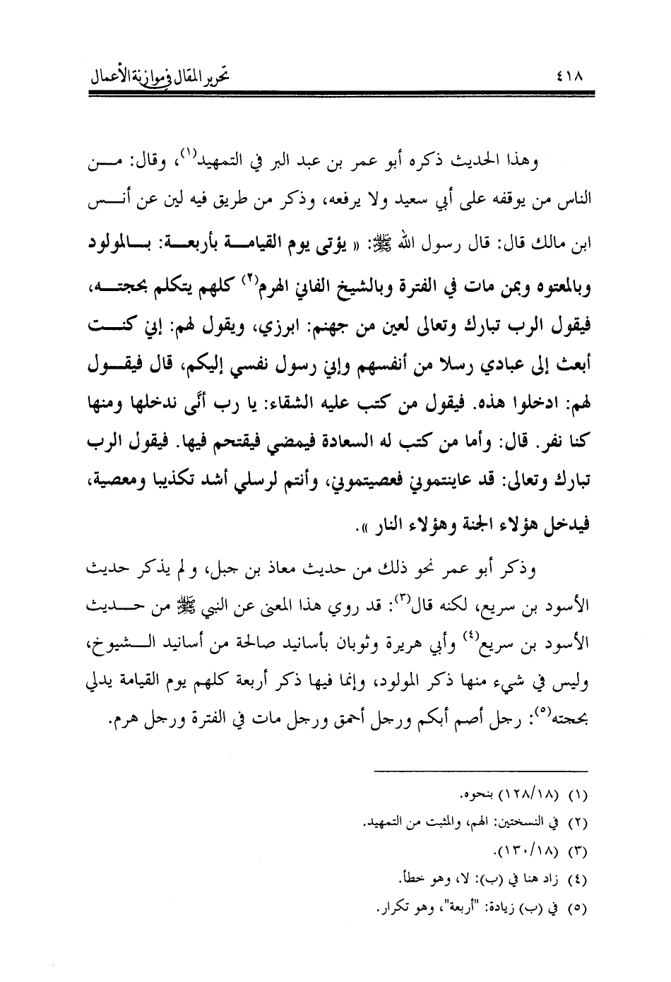 وذكر أبو عمر نحو ذلك من حديث معاذ بن جبل، ولم يذكر حديث الأسود بن سريع، لكنه قال (¬3): قد روي هذا المعنى عن النبي - صَلَّى اللهُ عَلَيْهِ وَسَلَّمَ - من حديث الأسود بن سريع (¬4) وأبي هريرة وثوبان بأسانيد صالحة من أسانيد الشيوخ، وليس في شيء منها ذكر المولود، وإنما فيها ذكر أربعة كلهم يوم القيامة يدلي بحجته (¬5): رجل أصم أبكم ورجل أحمق ورجل مات في الفترة ورجل هرم.