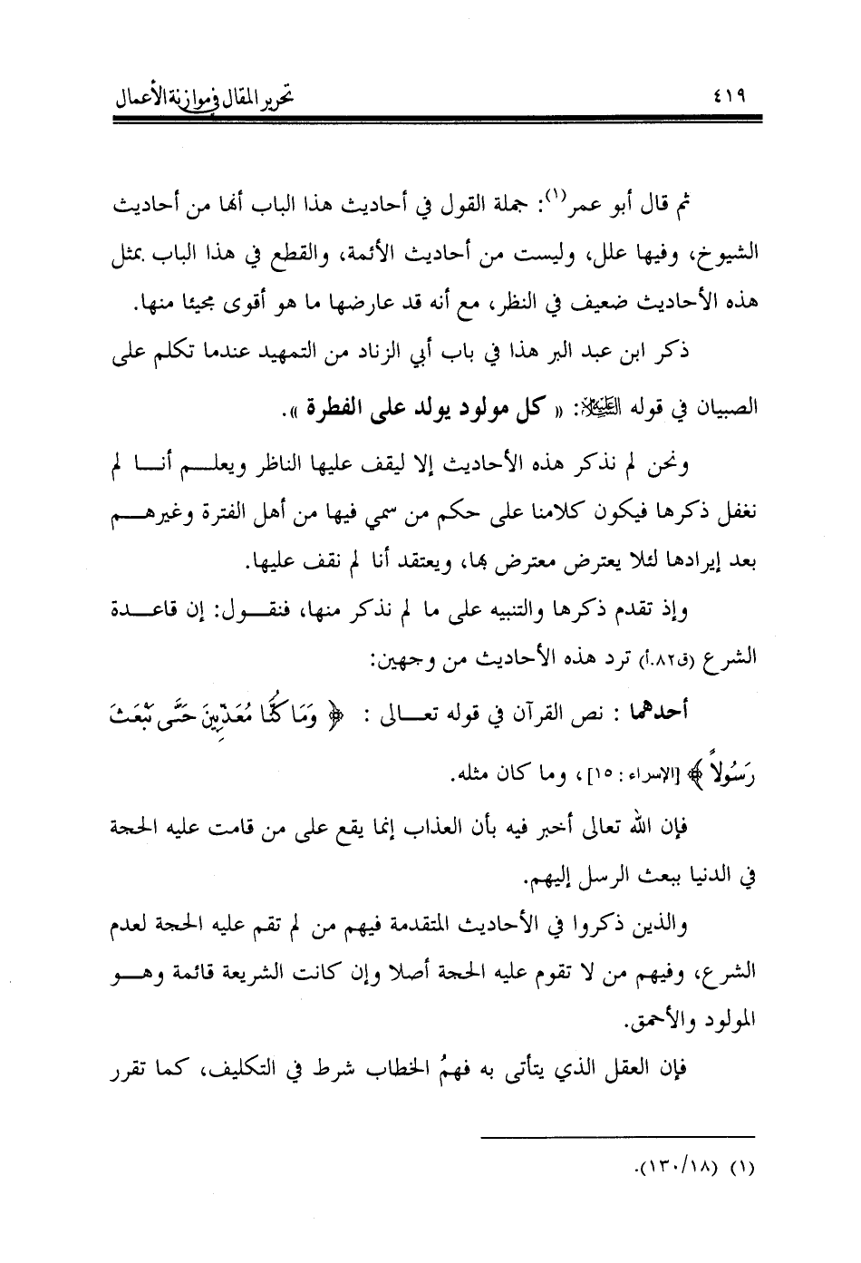 كتاب تحرير المقال في موازنة الأعمال وحكم غير المكلفين في العقبى والمآل (اسم الجزء: 1)